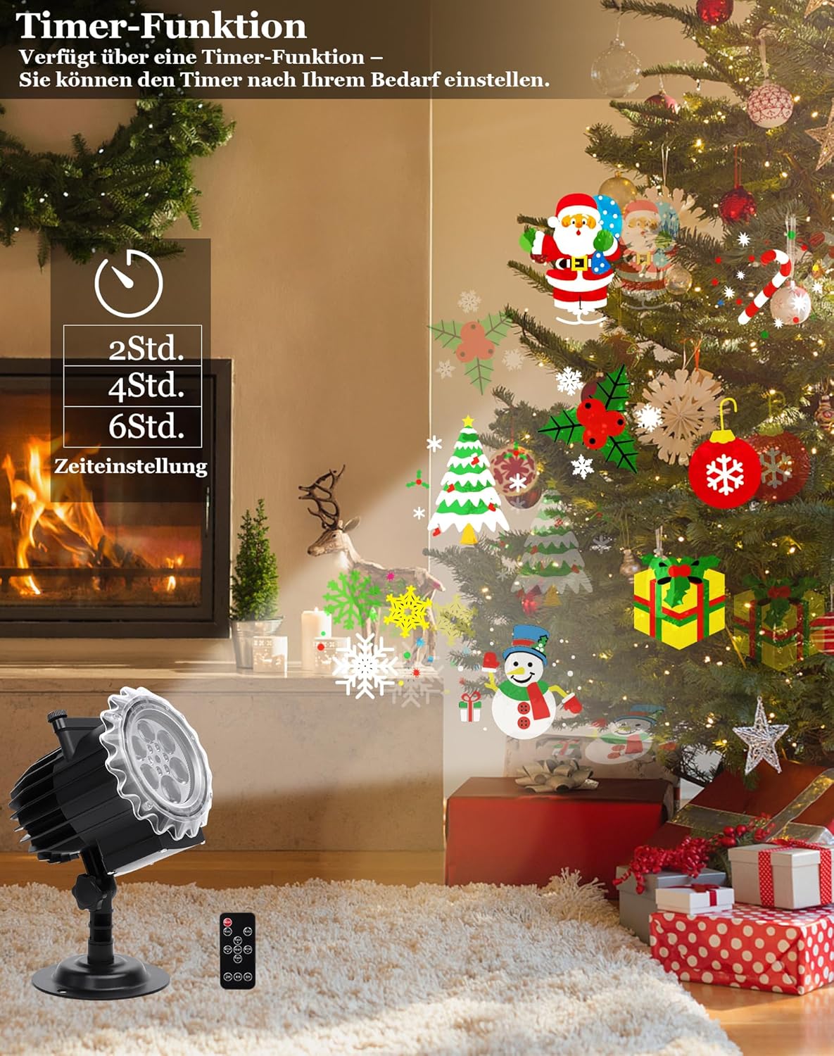 - Fernbedienung mit Timer: Es gibt 3 Arten von Timer-Einstellungen, die Timer-Einstellung ist für 2,4,6 Stunden verfügbar. Stellen Sie die Timer auf der Fernbedienung ein, um den Projektor jeden Tag zu einem bestimmten zeitpunkt automatisch einschalten,