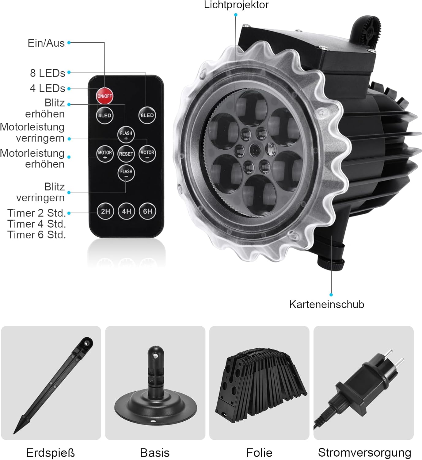 - LED Projektor für Aussen und Innen: Den Pfahl für den Aussenbereich in den Boden stecken, oder eine flache Basis für Aktivitäten im Innenbereich. Suchen Sie einfach den gewünschten Ort, schliessen Sie ihn an den Boden an, wählen Sie eine Folie aus,