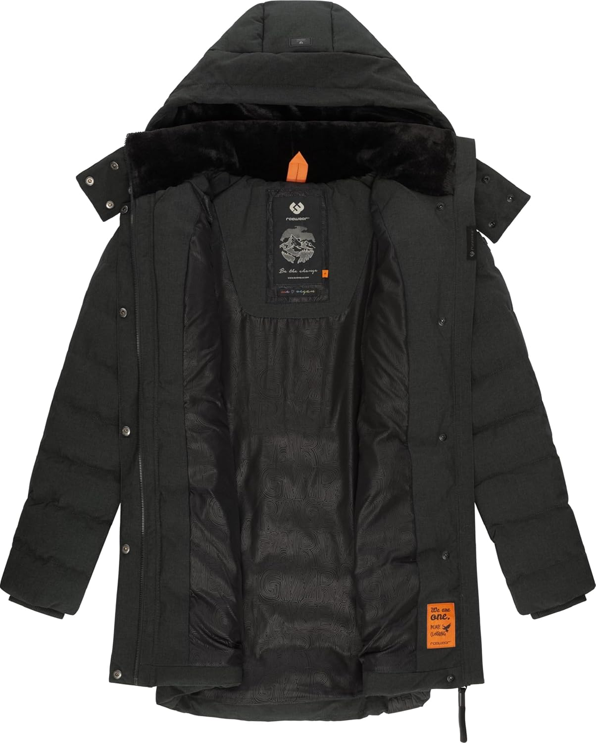 - LOOK: Stylischer Mantel mit grosser abnehmbarer Kapuze und hohem Kragen vom angesagten Street-Wear Label Ragwear, 100% vegan hergestellt