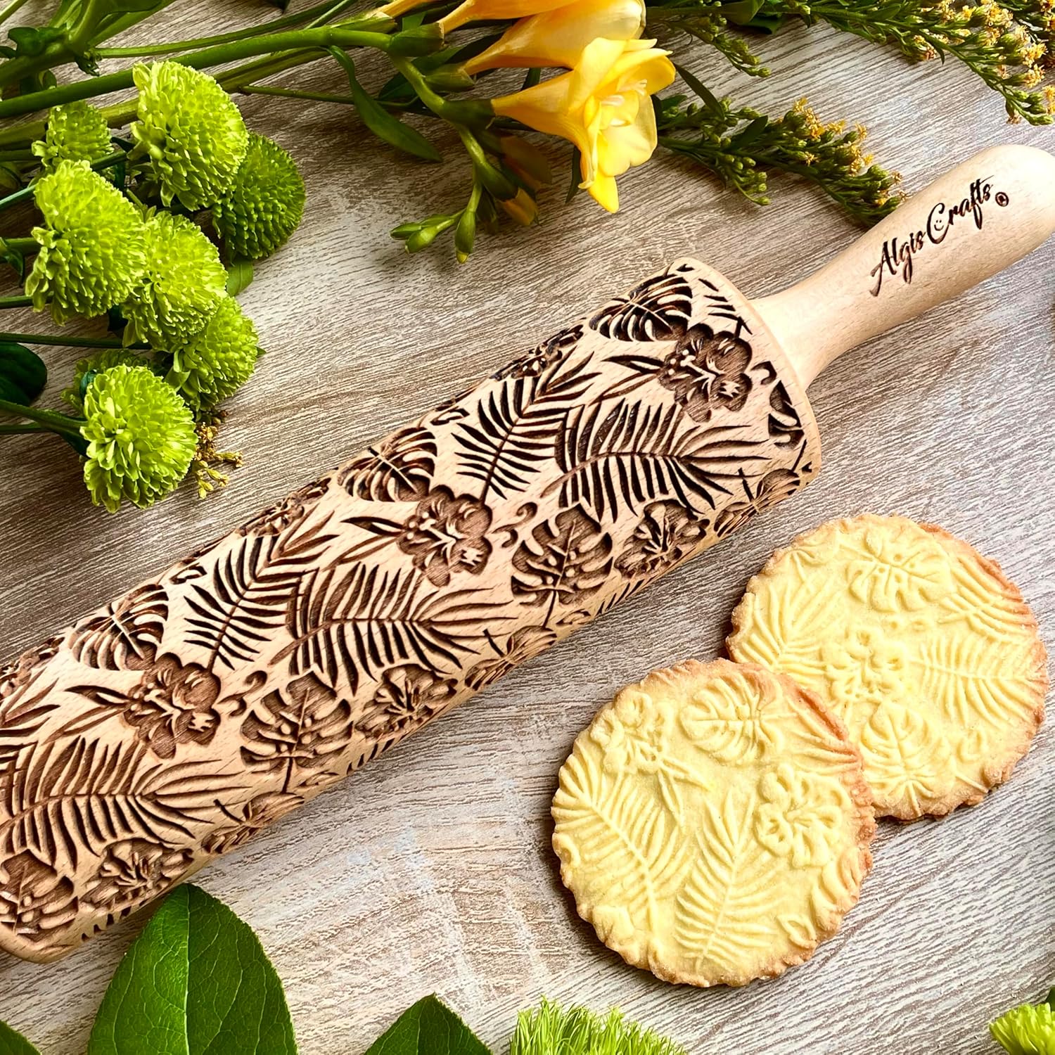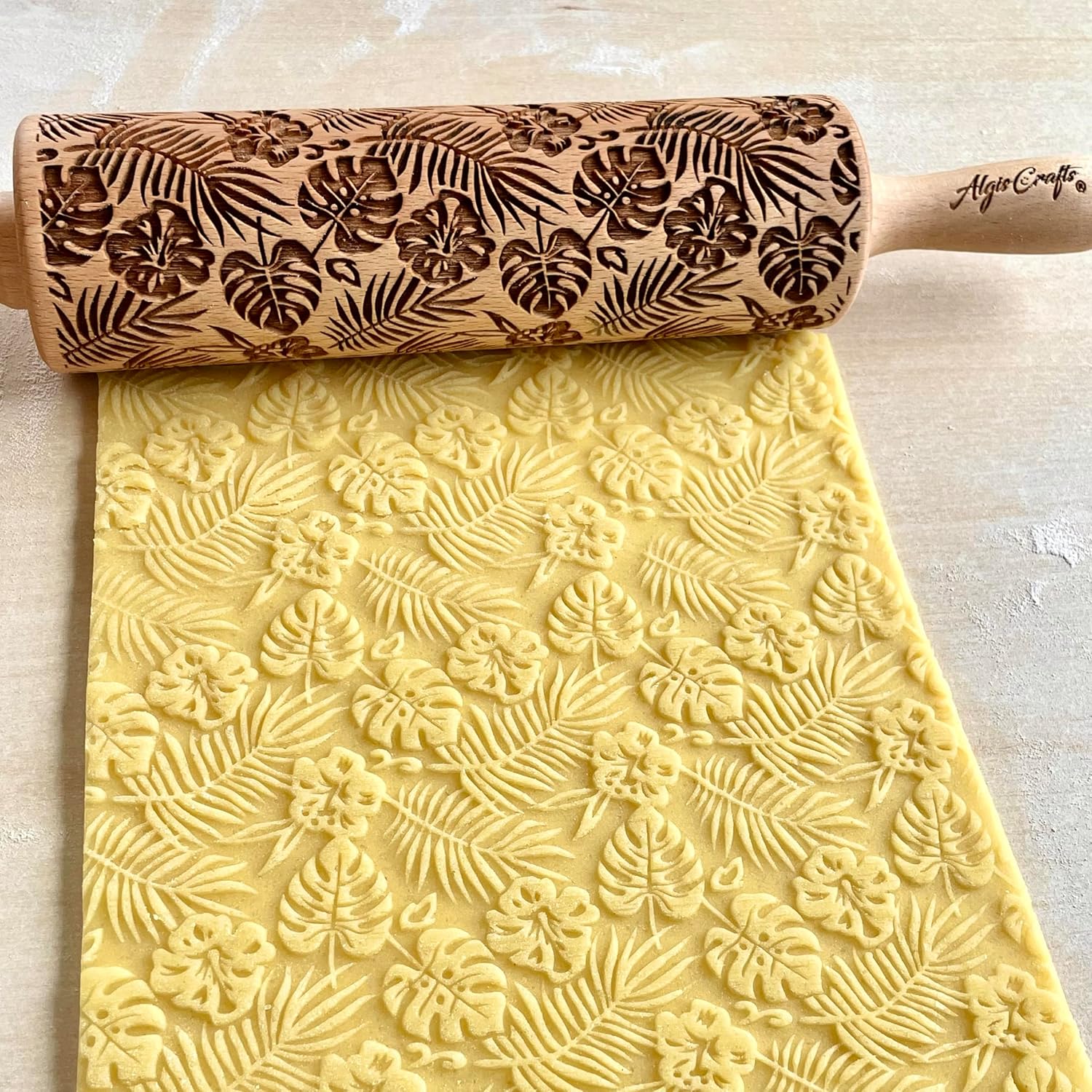 - Die Lasergravur wird auf dem Nudelholz angebracht und hinterlässt einen deutlichen Abdruck auf dem bearbeiteten Teig. Rollen Sie den Teig zuerst mit einem klassischen Nudelholz aus, anschliessend prägen Sie das Muster mit dem Prägenudelholz und