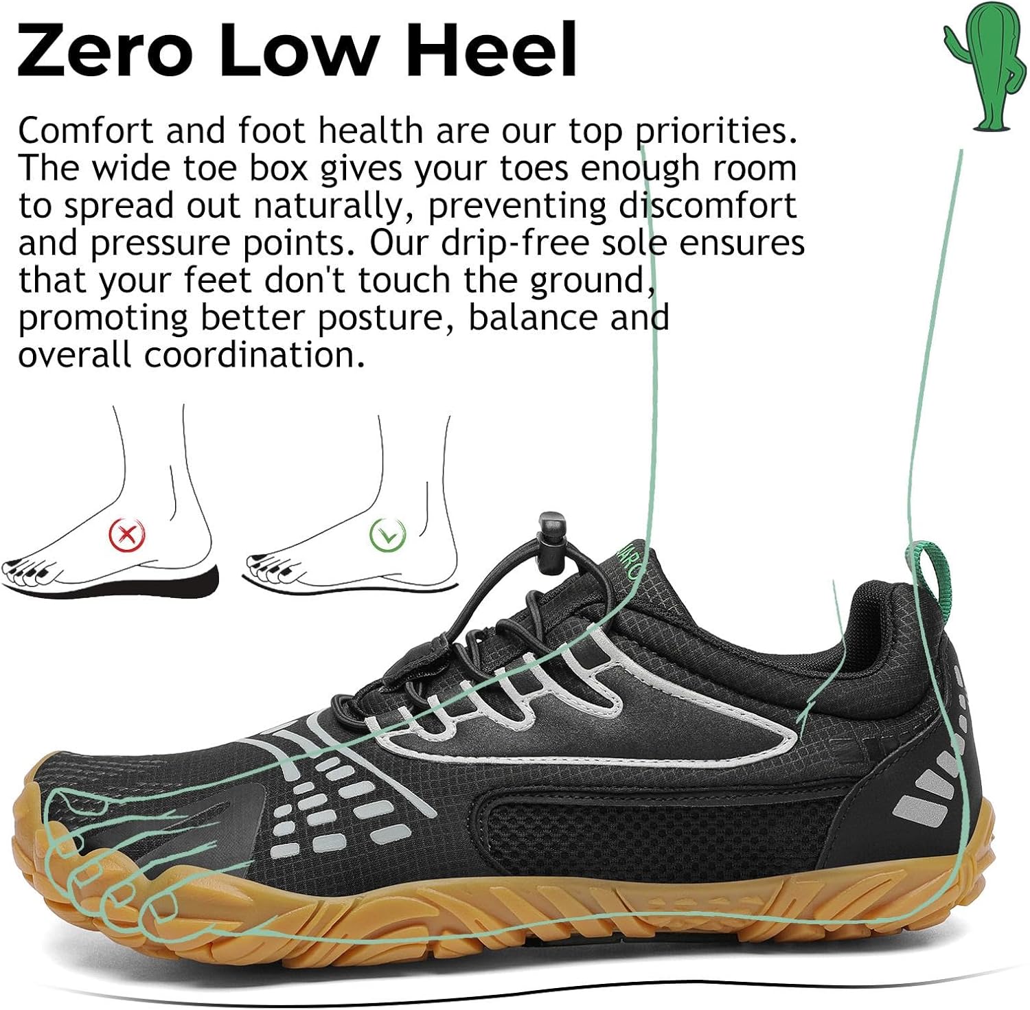 - Weite Zehenschuhe:Der weite Zehenraum bietet viel Platz für die Zehen, was den Komfort erhöht und eine bessere Anpassung an die Umgebung ermöglicht.