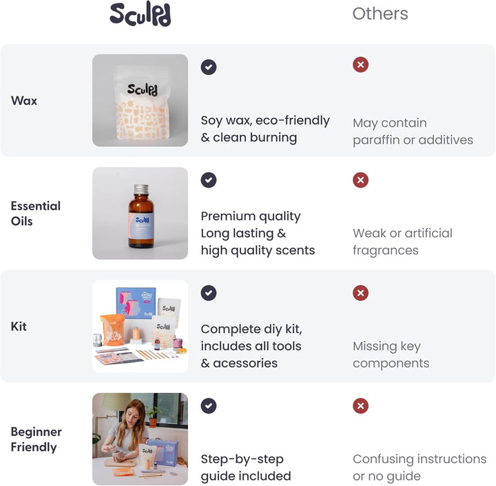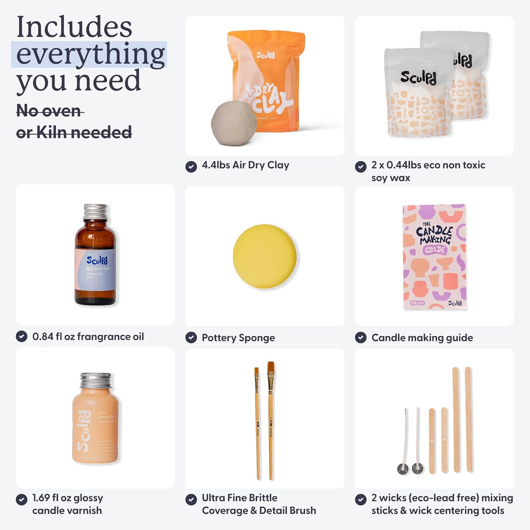 - Lieferumfang: 600 g hochwertiger, lufttrocknender Ton, 200 g umweltfreundliches, ungiftiges Sojawachs, 10 ml Duftöl, 50 ml feuersicherer Lack, 1 Pinsel mit ultrafeiner Borstenabdeckung, 1 Docht (bleifrei), Mischstab und Docht-Zentrierwerkzeug, Sculpd