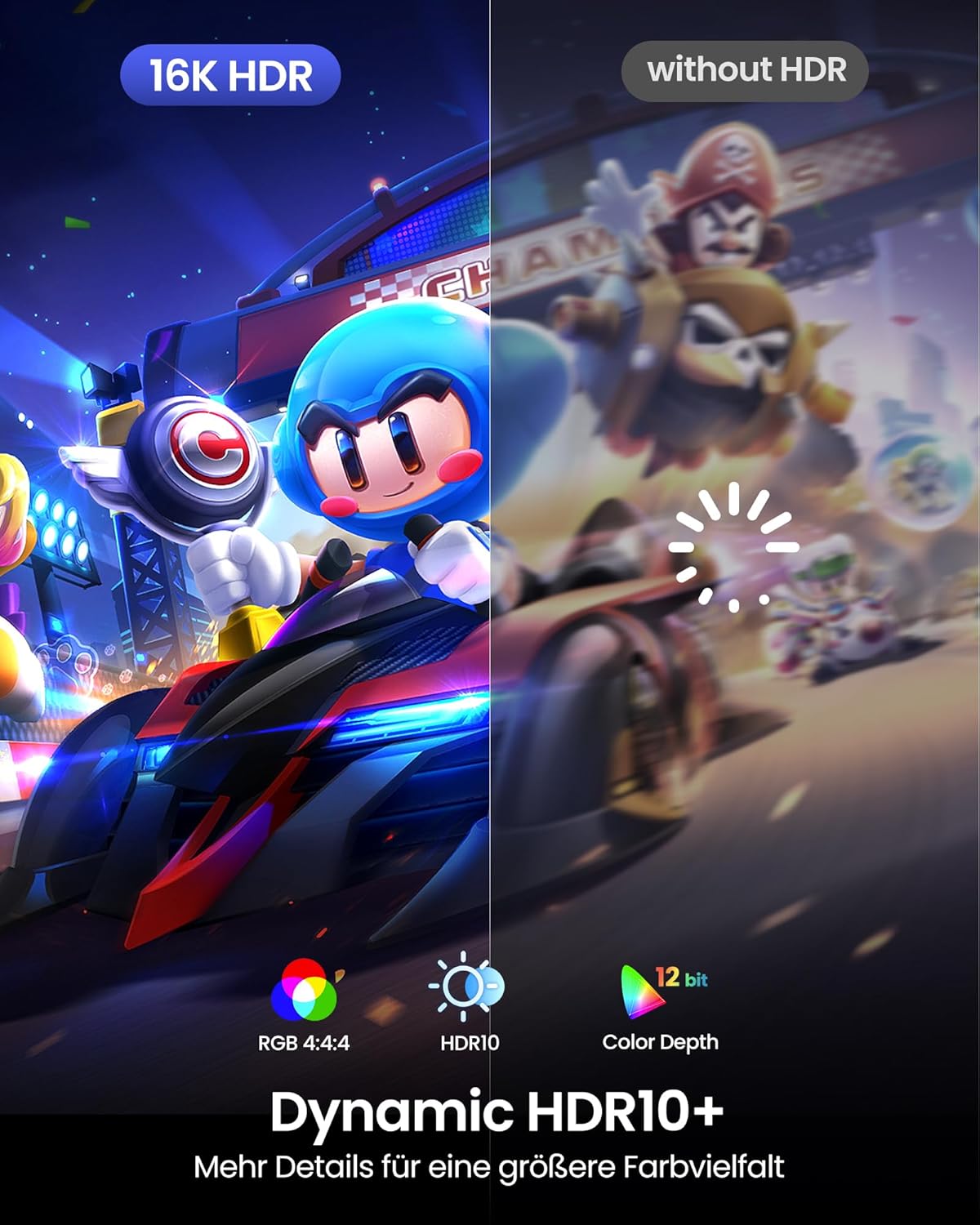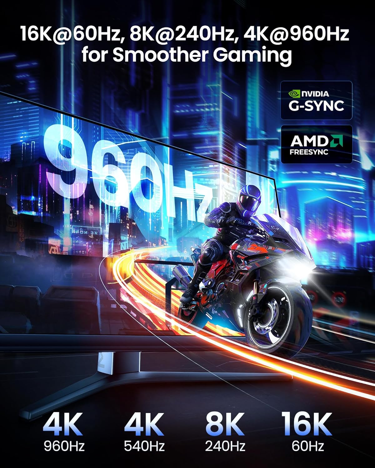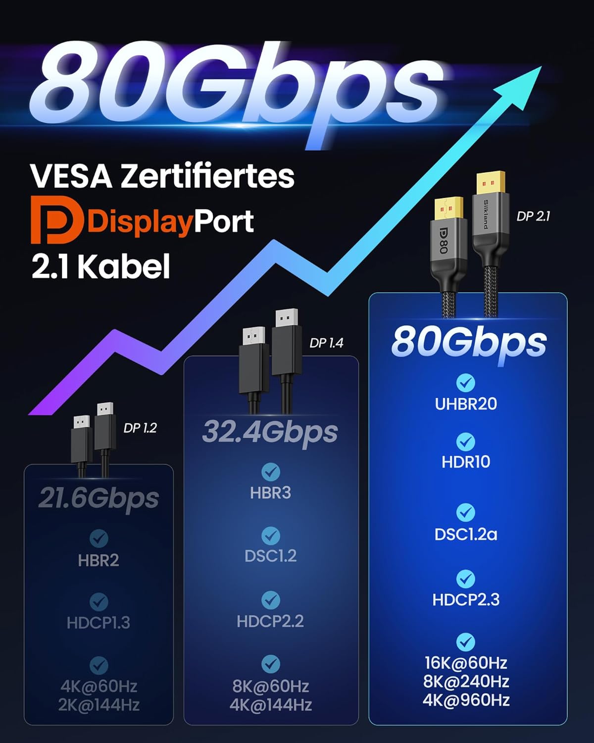 - đăVESA-zertifiziertes DP80 KabelăSilkland 2-Meter 16K DisplayPort 2.1 Kabel ist das erste VESA-zertifizierte DP80-Kabel. Es unterstĂŒtzt unterstĂŒtzt 16K@60Hz, 8K@240Hz, 4K@960Hz/540Hz/480Hz/360Hz mit aktivierter DSC1.2a. Kompatibel mit UHBR20,