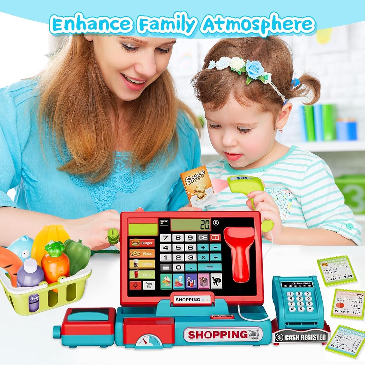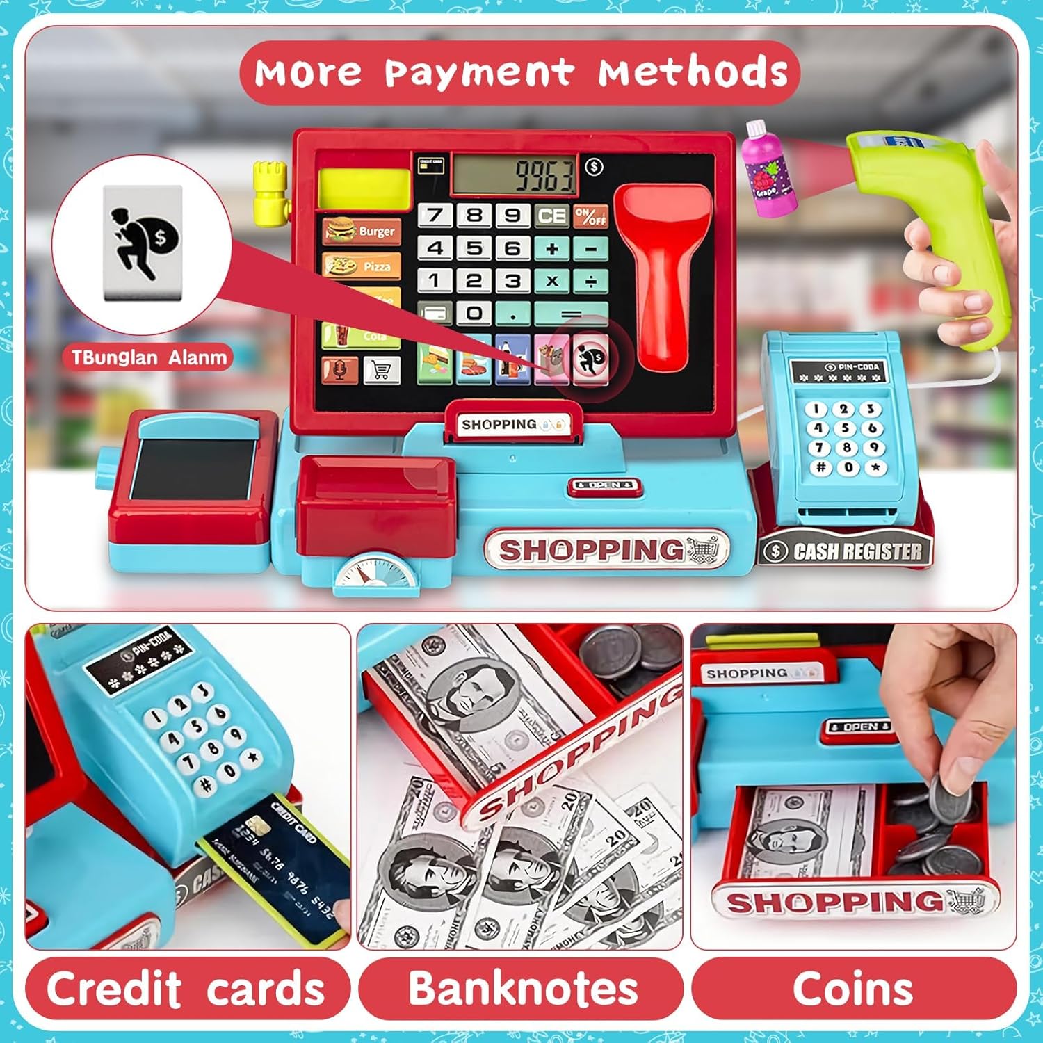 - Kassenspielzeug mit Taschenrechner: Dieses Kassenspielzeug verfügt über einen funktionierenden Taschenrechner, mit dem Kinder grundlegende Mathematik lernen, den Umgang mit Geld üben und ihre Kommunikationsfähigkeiten verbessern können!