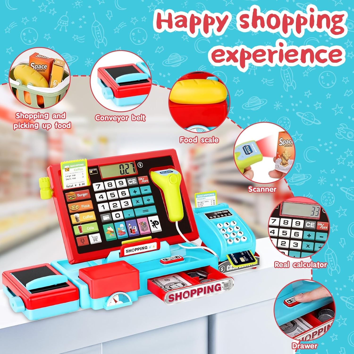 - Multifunktionales Taschenrechner-Spielset: Das Kassen-Spielzeug enthält einen Taschenrechner, ein Mikrofon, ein Förderband, Spielgeld, eine Kreditkarte, einen Einkaufskorb und Spiellebensmittel. Es fördert fantasievolles und aktives Spielen – Kinder
