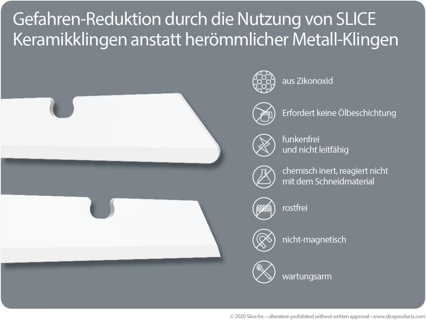 - KERAMIKKLINGE MIT FINGERFREUNDLICHEM SCHLIFF – Die Sicherheitsklinge aus technischer Keramik (Zirkonoxid) ist nicht leitend, chemisch inert, rostfrei und bleibt bis zu 11-mal länger scharf als Stahlklingen. Die patentierte, finger-friendly Klinge kann
