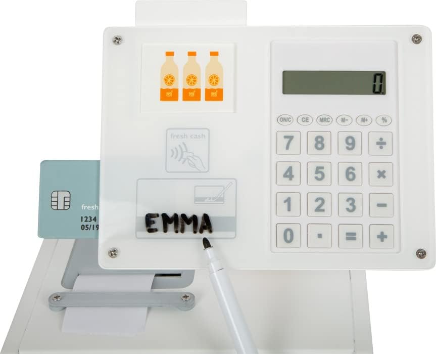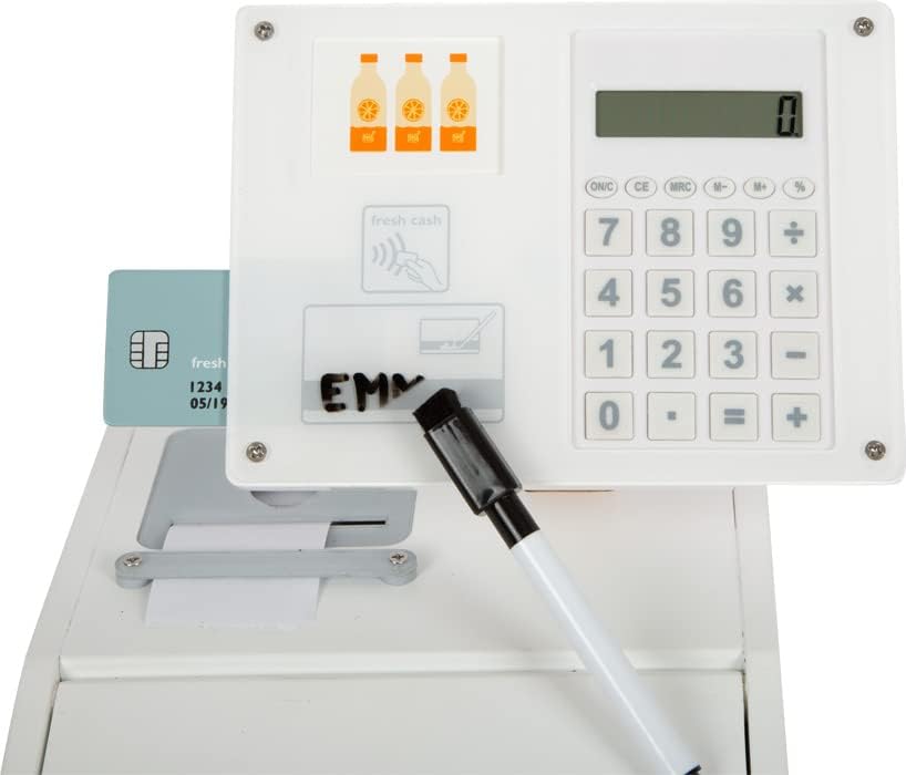 - Der in den Monitor integrierte, echte Taschenrechner sowie das zweigeteilte Kassenfach, das sich wie eine echte Supermarkt-Kasse öffnen lässt, sorgt für ein realistisches Rollenspiel (1x Knopfzelle LR1130, nicht enthalten)