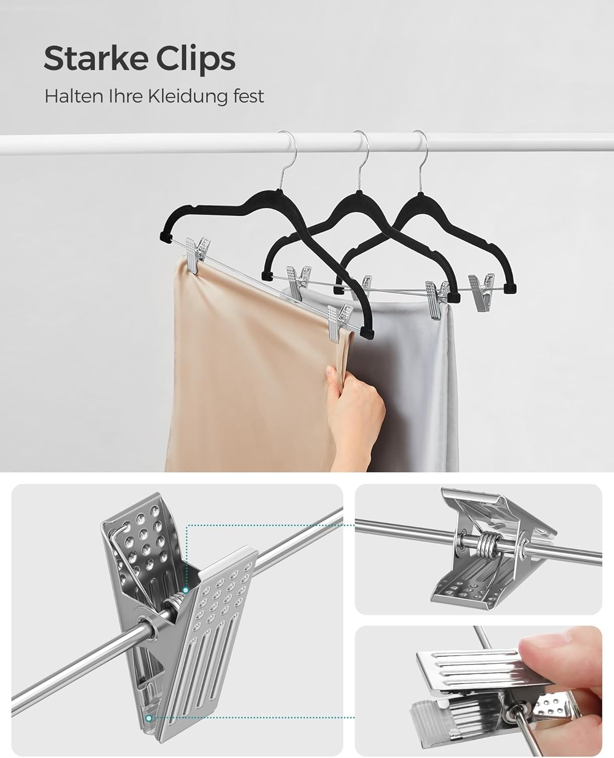 - [Flexible Clips] Der Abstand zwischen den 2 Klammern der Bügel ist verstellbar (maximaler Abstand: 38 cm) – für Hosen und Röcke verschiedener Grössen gut geeignet. Die Clips sind mit Gummi-Pads ausgestattet, die rutschfest sind und Ihre Kleidung
