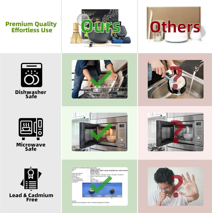 - Das gesamte Set besteht aus Bambus und hochwertiger Keramik. Bei diesem Produkt wurde kein Gemälde verwendet. Es besteht aus 100 % Bambus mit einem Pflanzenöl-Finish, um seine Haltbarkeit zu erhöhen. Die Matcha-Schalen sind lebensmittelecht, blei- und