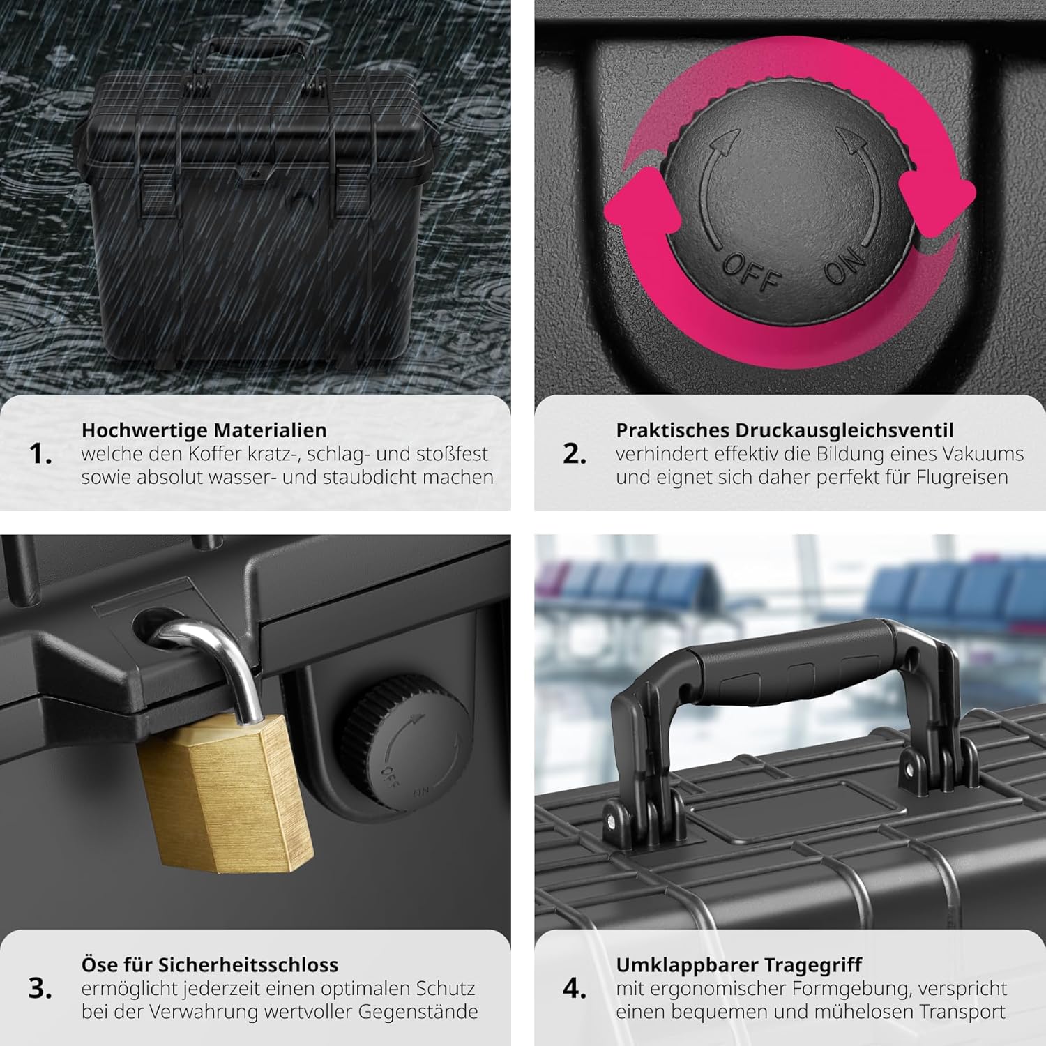 - ROBUSTE AUFBEWAHRUNGSKOFFER KONSTRUKTION: Geniesse langlebige Zuverlässigkeit mit diesem abschliessbaren Kunststoffkoffer. Unser wasserdichter Koffer ist auch noch wetter-, schlag- und staubdicht. Ein Dichtungsring und ein Druckausgleichsventil