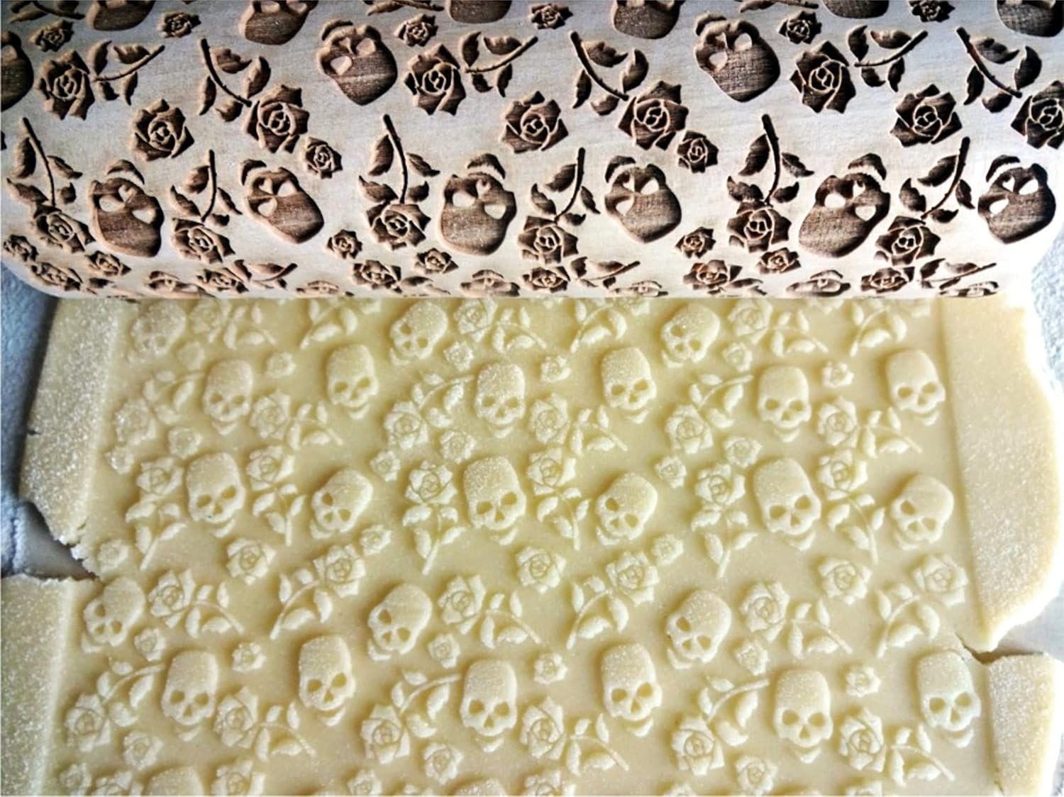 - Die Lasergravur wird auf dem Nudelholz angebracht und hinterlässt einen deutlichen Abdruck auf dem bearbeiteten Teig.