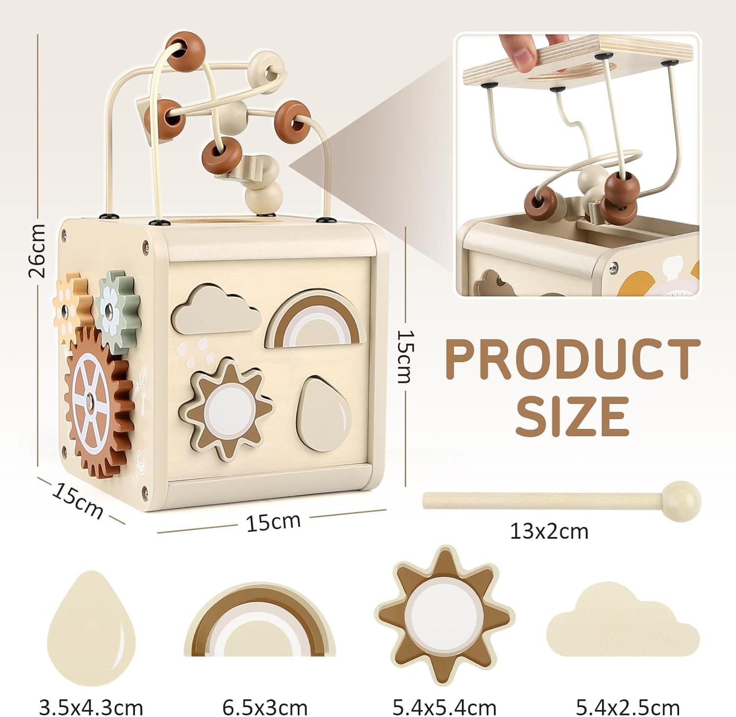 - 5 IN 1 Motorikwürfel für Babys:Diese motorikwürfel gross bietet fünf verschiedene Spielarten und ermutigt Kinder, Formen zu klassifizieren, die Uhr zu lernen, Zahnräder zu drehen, Xylophon zu spielen und sich durch Perlenlabyrinthe zu bewegen.