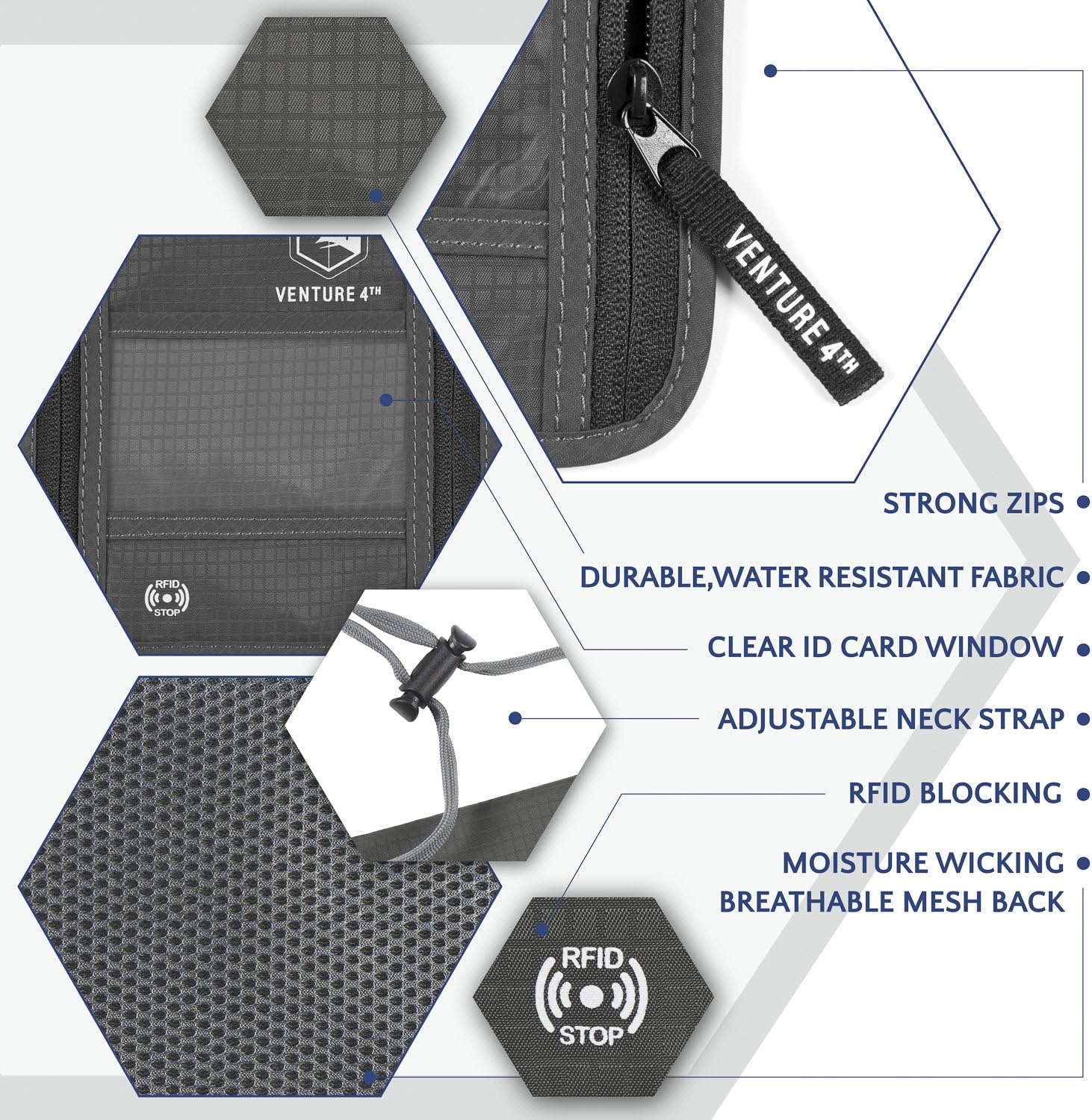 - ✅GEEIGNET FÜR DAMEN UND HERREN - 14 cm hoch und 20 cm breit - der Venture4th RFID-Passhalter kann bequem um den Hals und unter der Kleidung getragen werden, um gegen Taschendiebe zu schützen. Er ist dünn genug, um praktisch unsichtbar zu sein,