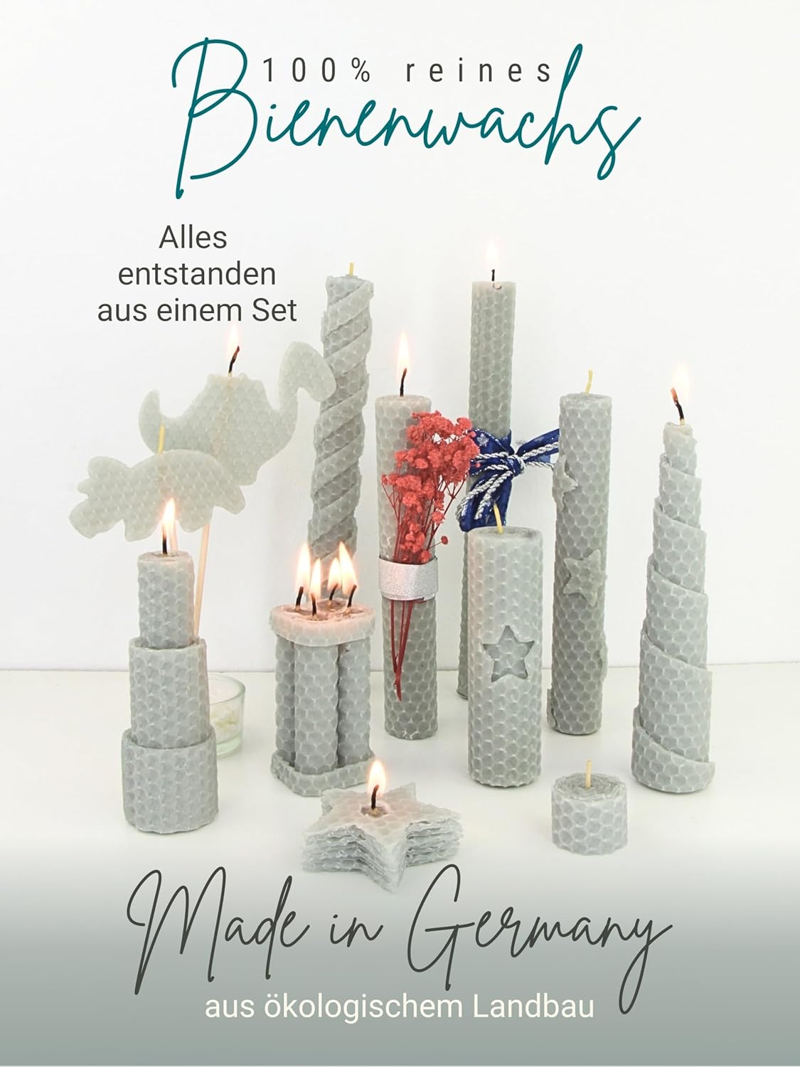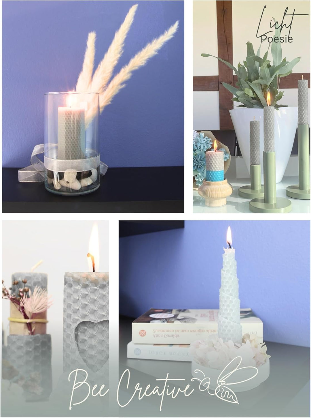 - 🕯️ DEIN KOMPLETTES STARTERSET FÜR 10 KERZEN – Alles drin, was Du brauchst: 10 farbige Bienenwachsplatten (20 × 15 cm), 10 vorgewachste Hanfdochte (21 cm Länge) und eine ausführliche, bebilderte Anleitung. Ideal, um sofort loszulegen – auch
