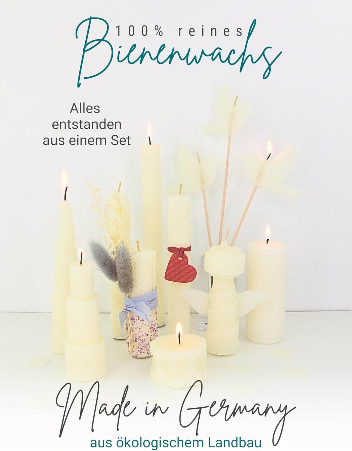 - 🕯️ DEIN KOMPLETTES STARTERSET FÜR 10 KERZEN – Alles drin, was Du brauchst: 10 farbige Bienenwachsplatten (20 × 15 cm), 10 vorgewachste Hanfdochte (21 cm Länge) und eine ausführliche, bebilderte Anleitung. Ideal, um sofort loszulegen – auch