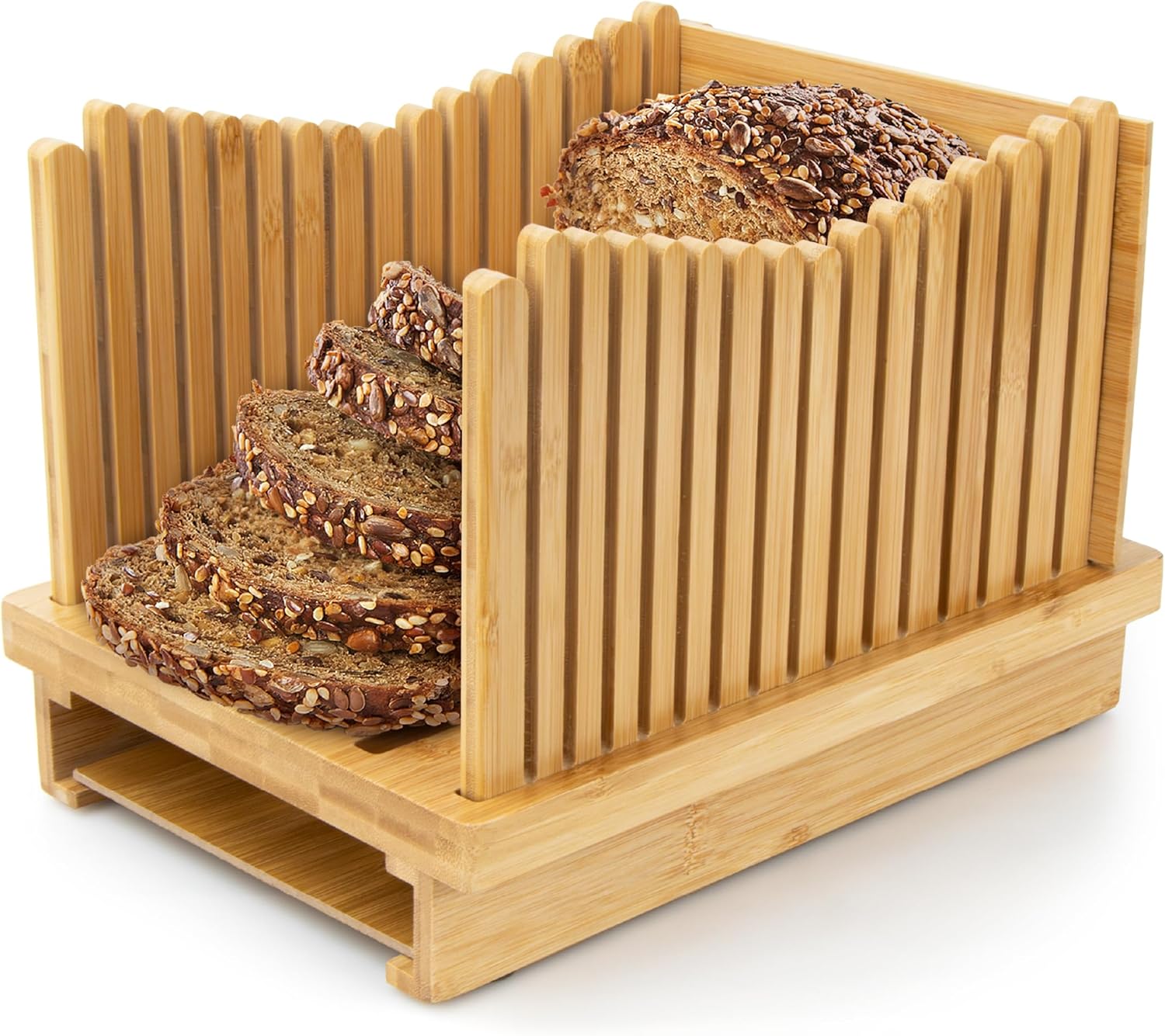 - Kompaktes Design: Diese abnehmbare Bambus-Brotschneidemaschine kann geteilt und zu flachen Oberflächen kombiniert werden, um Platz auf der Arbeitsfläche zu sparen. Perfekt für kleine Küchen, Wohnungen.
