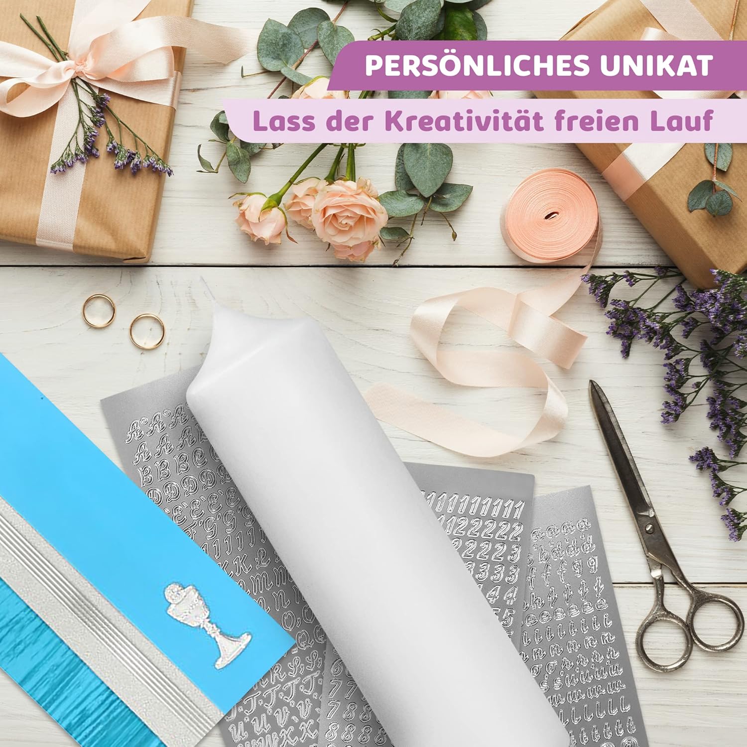 - 🕯️ EINZIGARTIG: Verzieren Sie mit diesem DIY-Set ganz einfach Ihre persönliche & individuelle Kerze. Die ideale Geschenk-Idee für feierliche Anlässe, wie Hochzeit oder Taufe