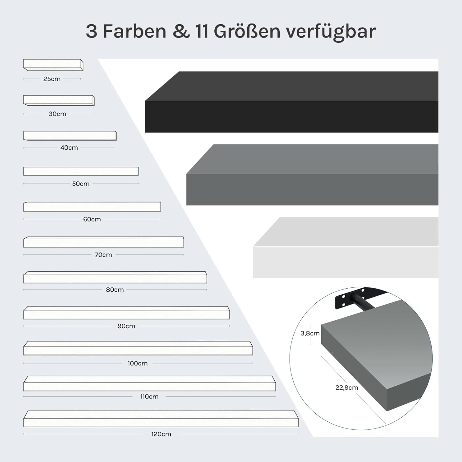 - VIELE GRÖSSENOPTIONEN: Das Regalbrett ist 22,9 cm tief und 3,8 cm dick, seine Breite ist in 25, 30, 40, 50, 60, 70, 80, 90, 100, 110, 120 cm erhältlich, damit Sie das passende Wandregal wählen und eine Ausstellungswand gestalten können