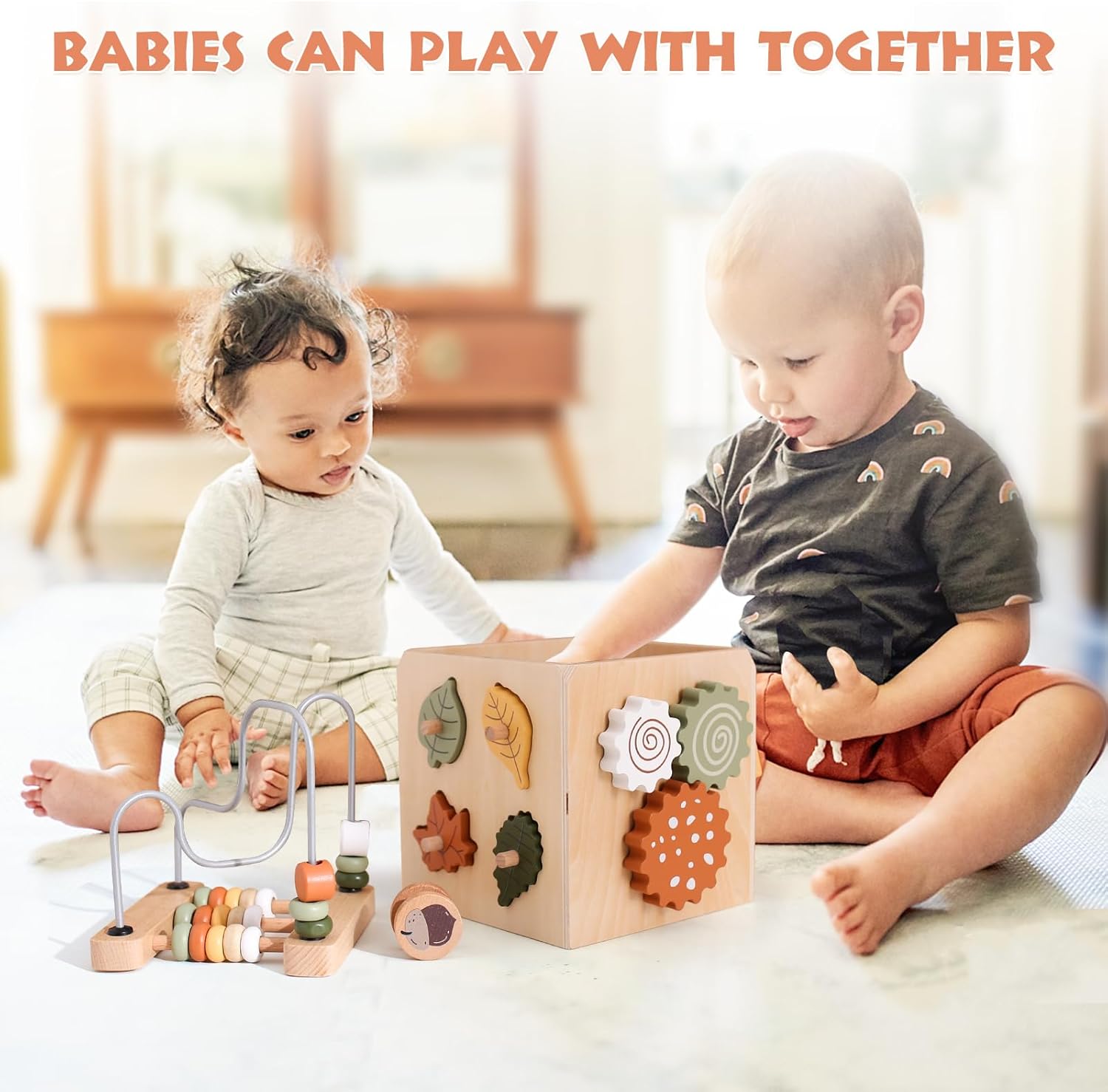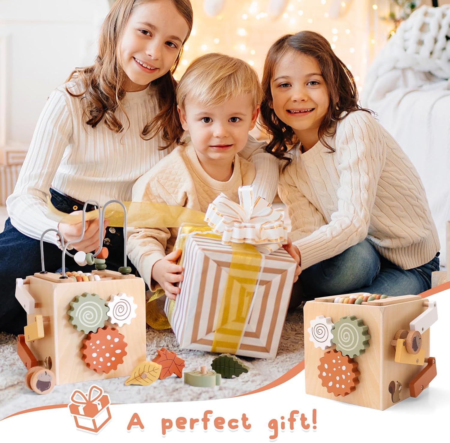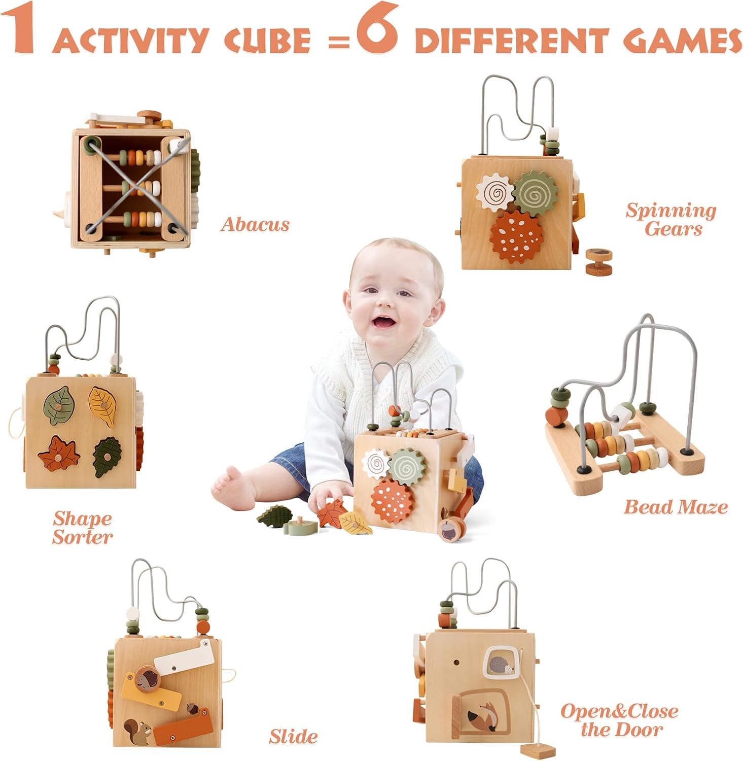- 【6 in 1 Aktivitätswürfel aus Holz】Dieser Motorikwürfel hat 5 verschiedene Spielseiten (6 Spielarten): Perlenlabyrinth, Blätter Formensortierer, drehende Zahnräder, Abakus, Eichhörnchen-Rutsche, Öffnen und Schliessen von Türen und Fenstern, Es