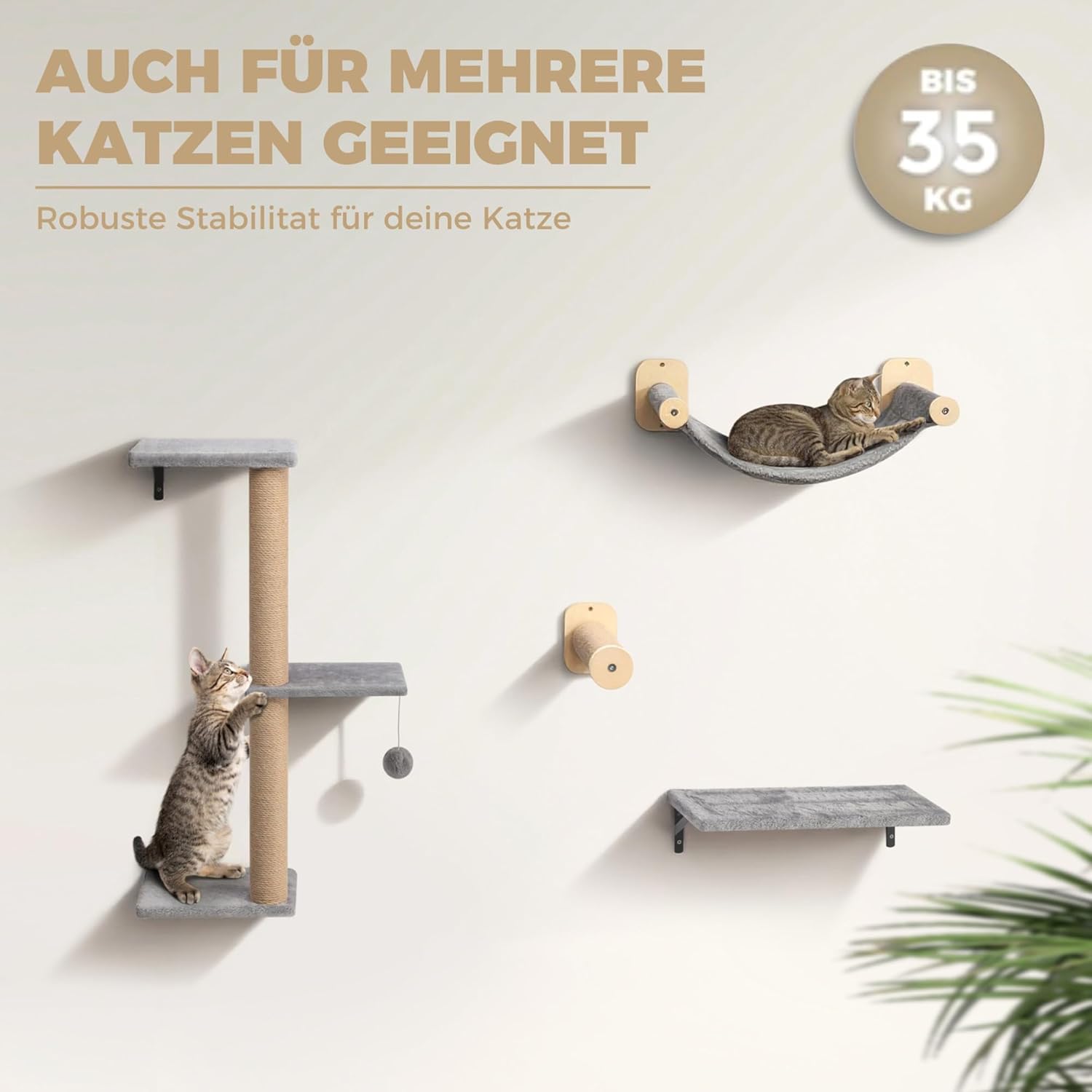 - 🐾 SICHER & STABIL – Die Katzen Wand Klettern gibt Vertrauen. Robuste Holzplatten, Sisal-Kratzstamm und starke Halterungen tragen bis 35 kg. Auch für grosse Katzen bestens geeignet.