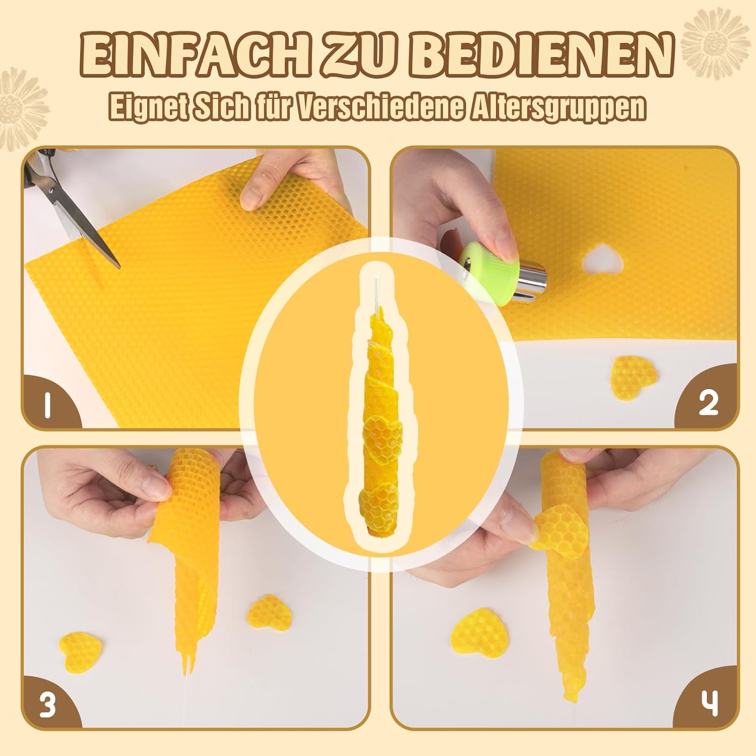 - ✨【Leicht zu Machen】Mit unseren bienenwachsplatten für kerzen benötigen Sie keine speziellen Werkzeuge oder Vorkenntnisse. Setzen Sie den Docht in die Platte, rollen Sie diese auf und prägen Sie mit den Formen hübsche Muster – schon ist eine