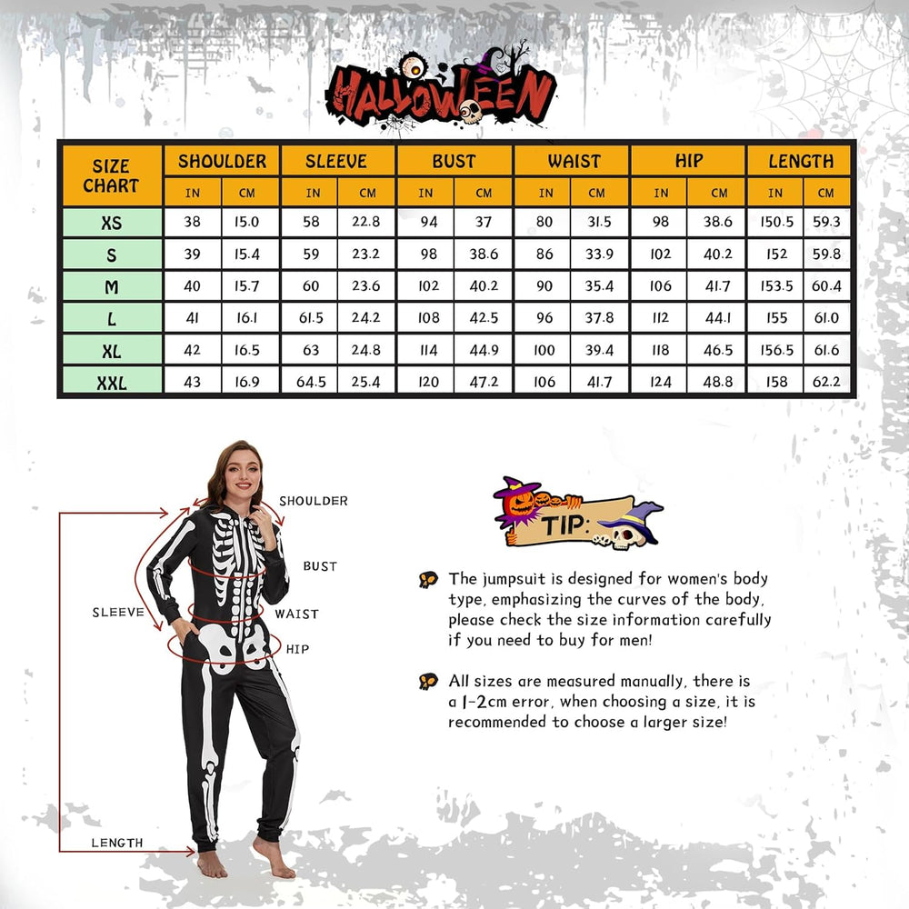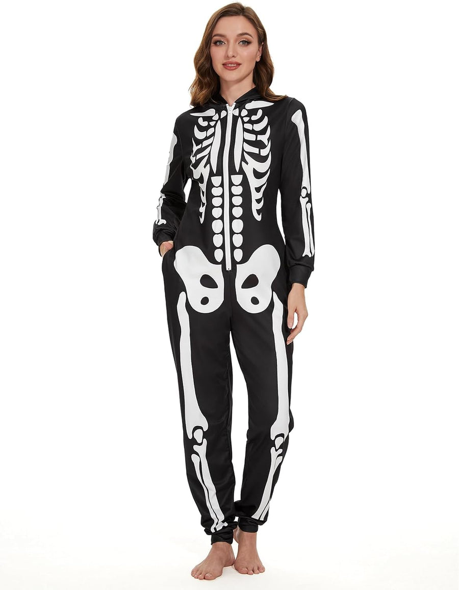 Ulikey Halloween Skelett Kostüm Damen, Halloween Skelett Onesie Overall Pyjama Erwachsene Damen Hall
