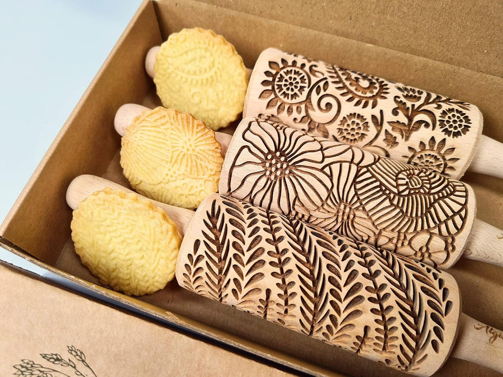 Blumen 3-er Set Kinder Nudelhölzer für hausgemachtes Gebäck. Teigrolle mit Mohn, Paisley, Blume, Flu