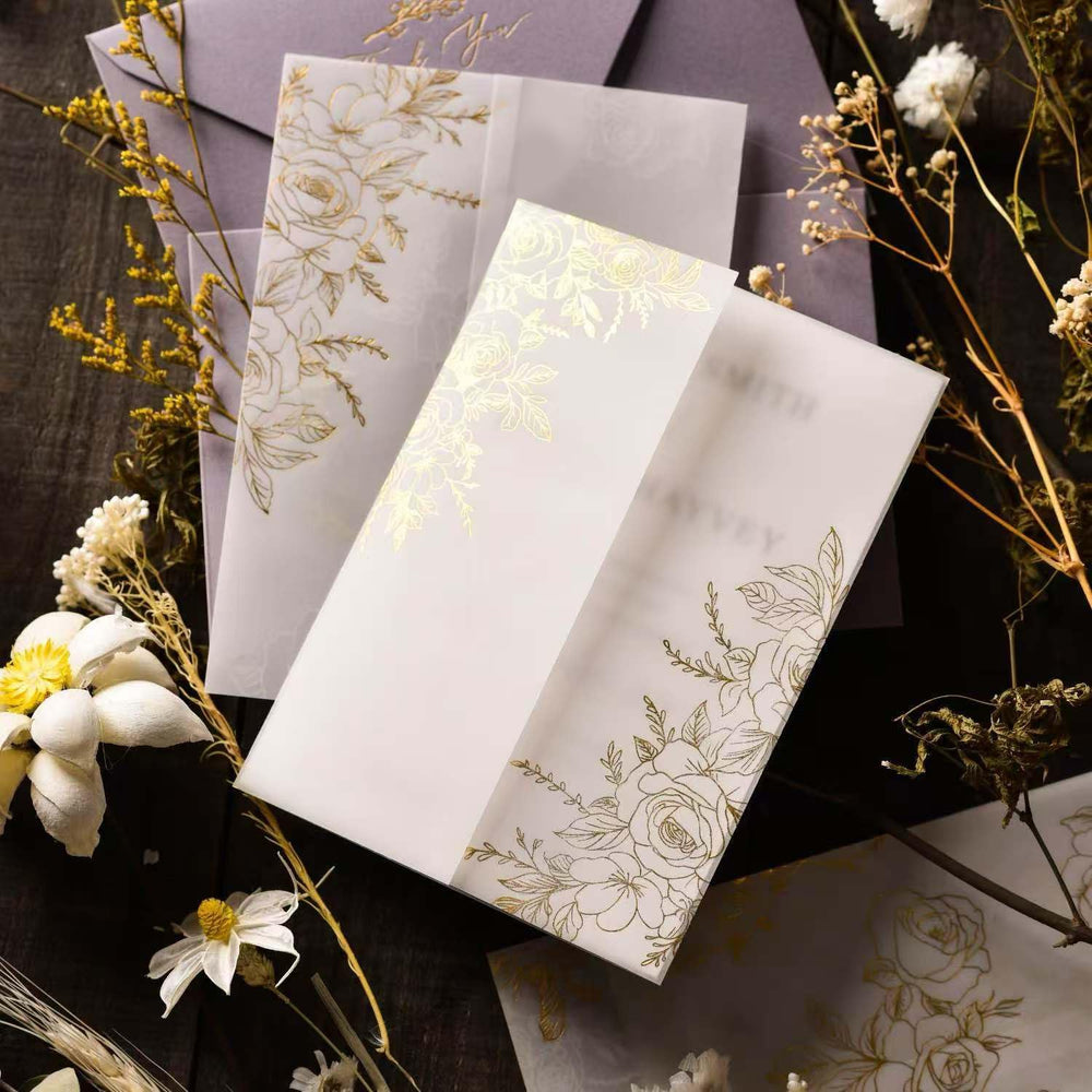 Puremigo 50 Stück vorgefaltete Pergamentumhüllen für 12,7 x 17,8 cm Einladungen – Goldfolienmuster –