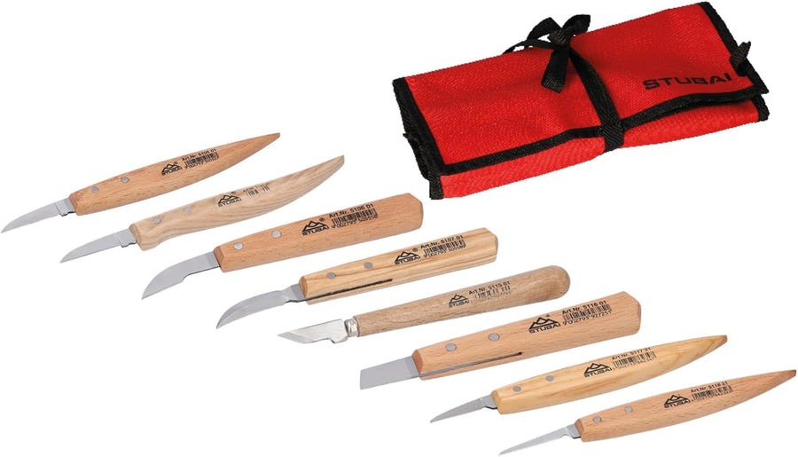 STUBAI Schnitzersatz 9-teilig in Rolltasche | Schnitzmesser mit Holzheft, Holzschnitzwerkzeug für fe