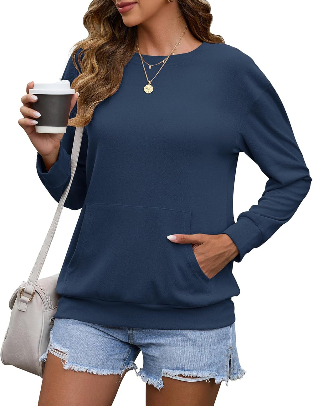 WNEEDU Damen Langarmshirts Lässige Sweatshirts mit Taschen Dunkelblau S, Dunkelblau S