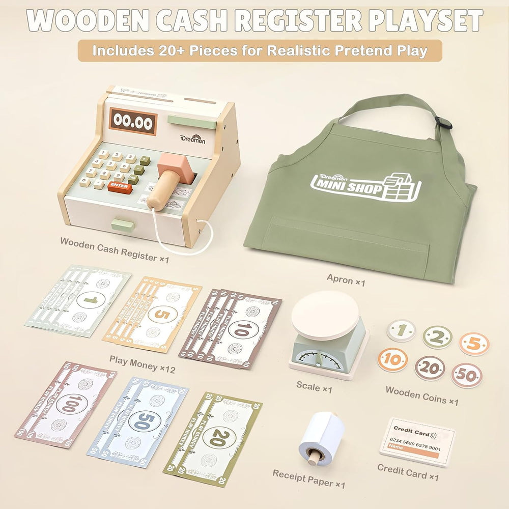 Dreamon Holz Kasse Kinder, Holz Spielkasse Kinderkasse mit Scanner Kaufladen Spielzeug mit Schürze G