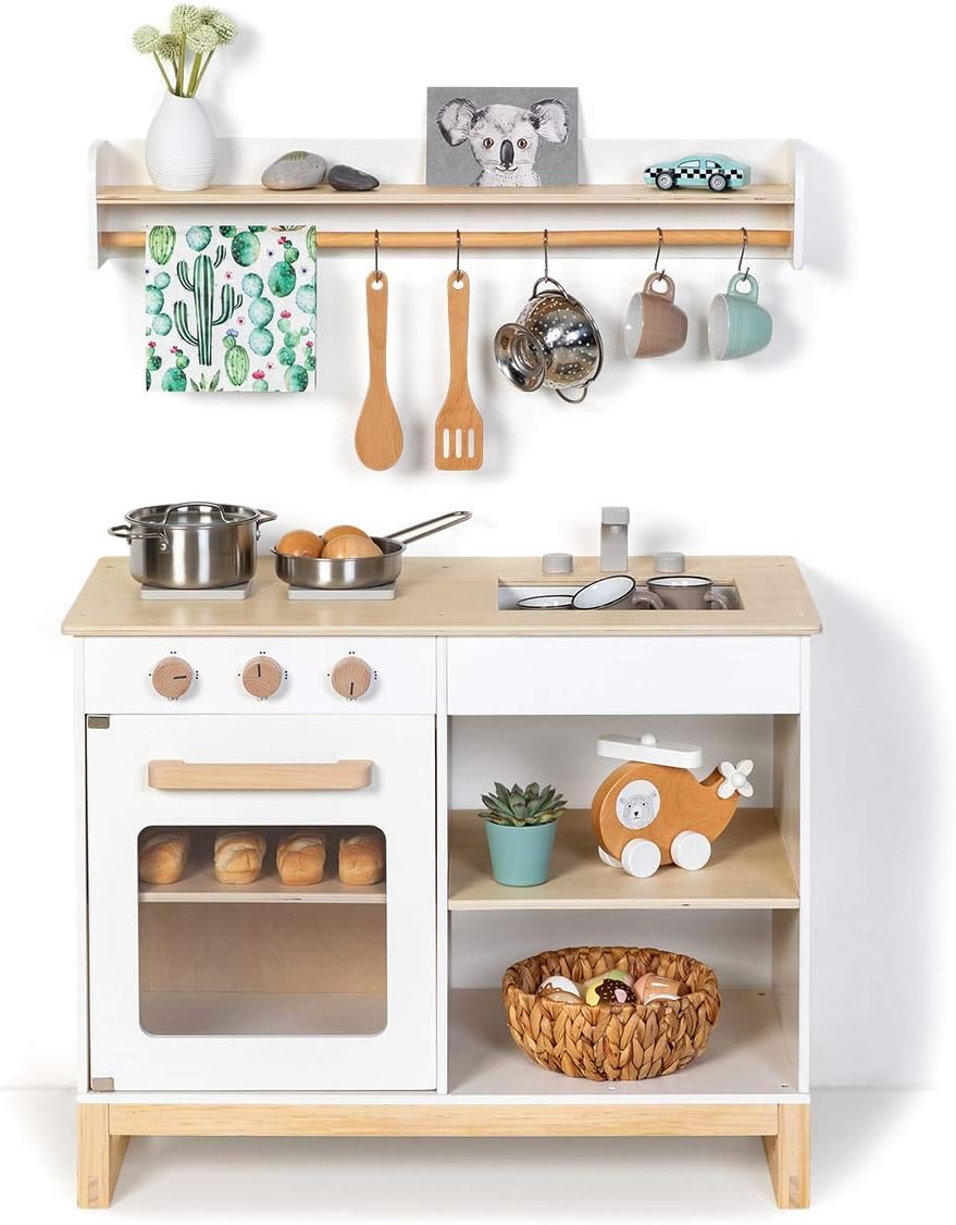 ROBUD Spielküche Holz für Kinder, Modern Marmor-Stil Kinderküche mit Realistischem Ofen, Herd & Kaff