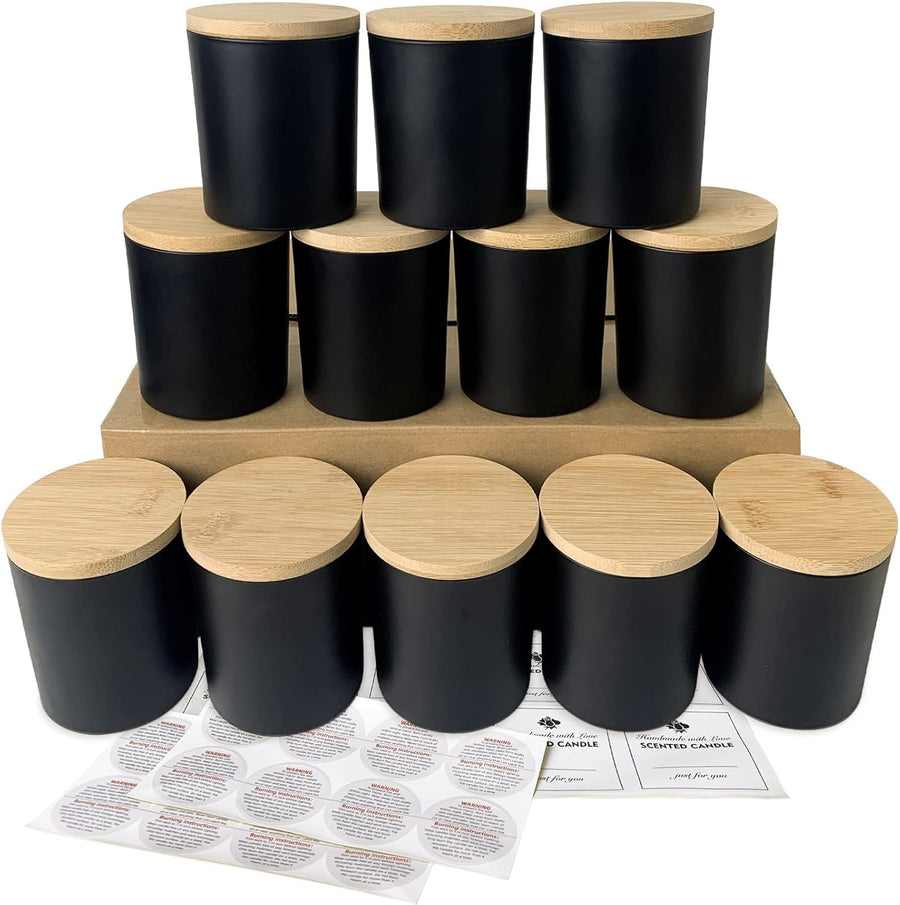 CONNOO 12 Stück 284 ml mattschwarze Glas-Kerzengläser mit Bambusdeckel für die Herstellung von Kerze
