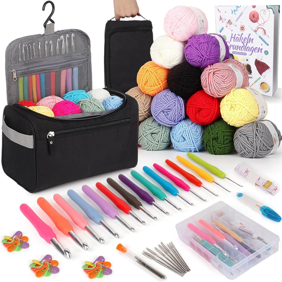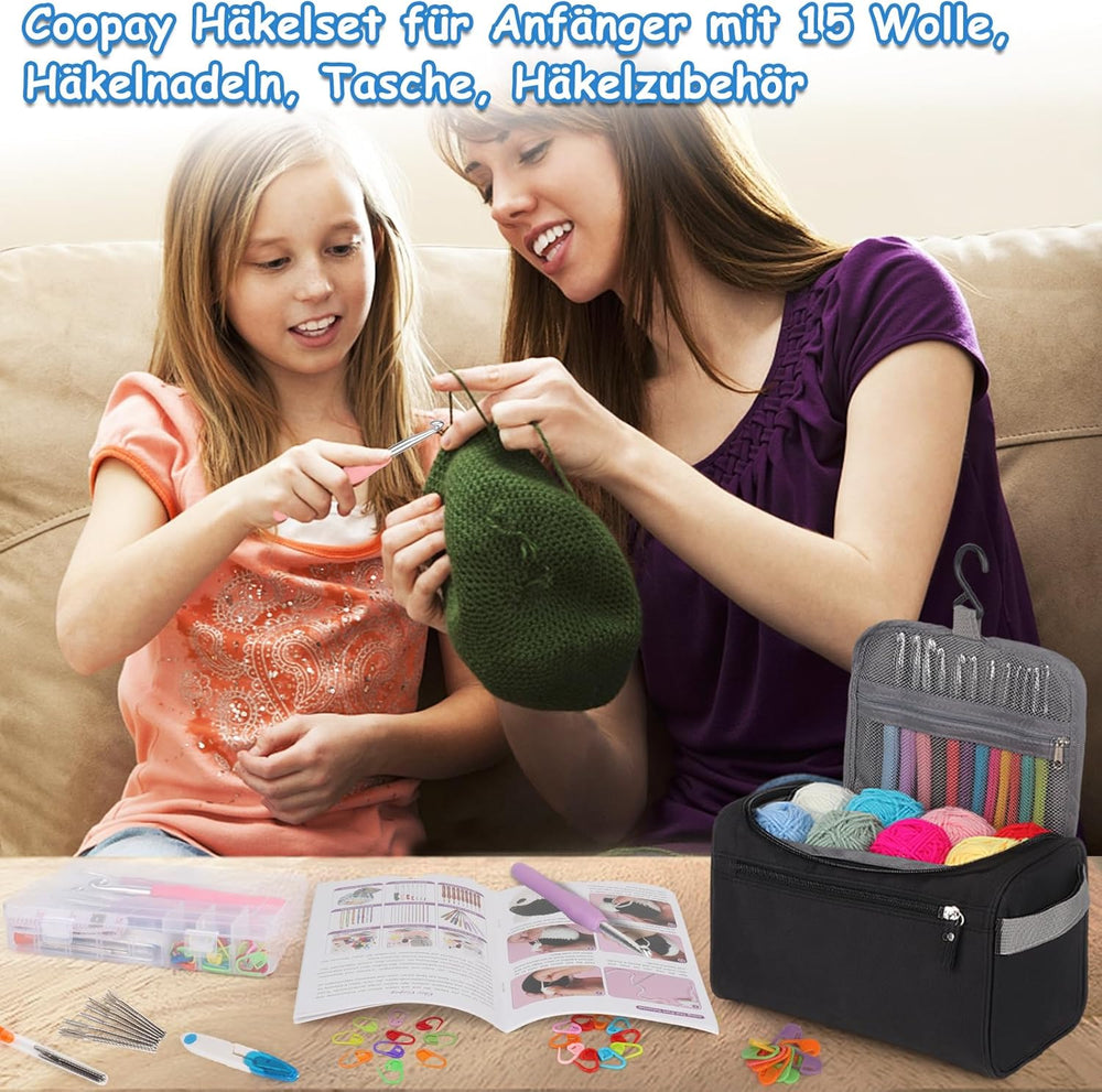 Coopay 73 Stück Häkelset für Anfänger, Tragbar Häkelnadel Set mit 15 Wolle, Tasche, Häkelzubehör, 2,