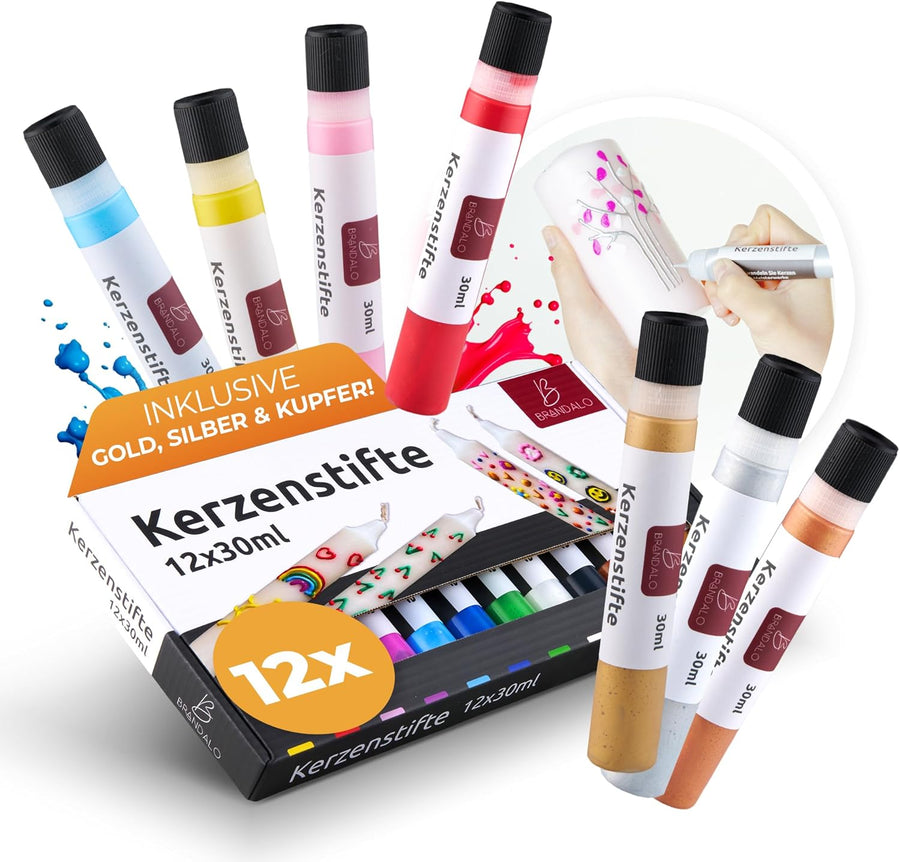 Brandalo® Premium 12er Set Kerzenstifte á 30ml leuchtende Farben – Candle Pen für Kerzen - Taufkerze