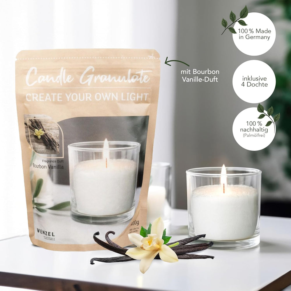 Kerzensand Bourbon Vanille Kerzen Granulat 400g - Weisses Paraffinwachs für DIY-Kerzen, Inkl. 4 Doch