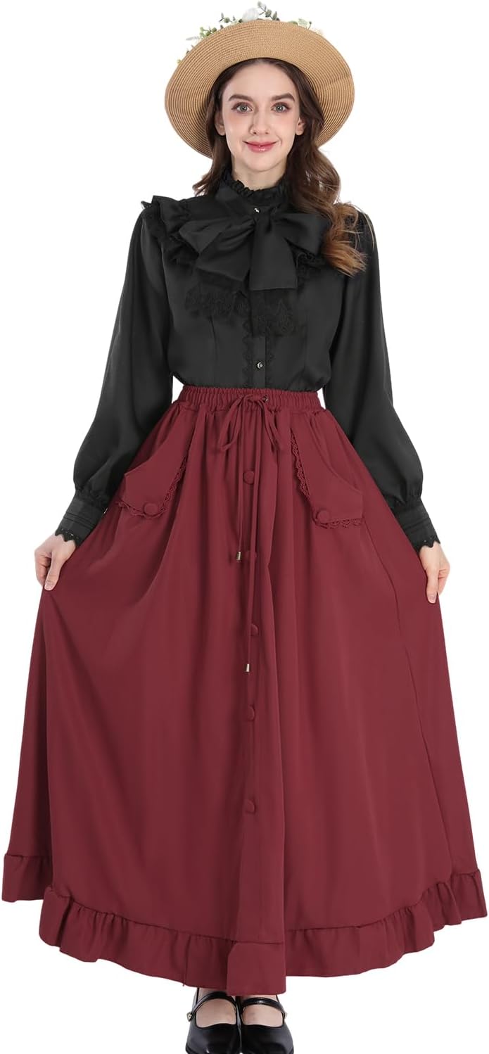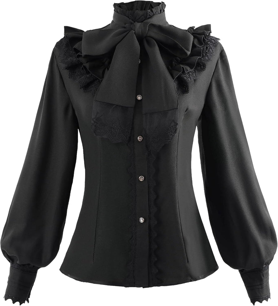 CR ROLECOS Viktorianische Bluse Damen Stehkragen Damen Mittelalter Rüschenbluse Vintage Bluse Schwar