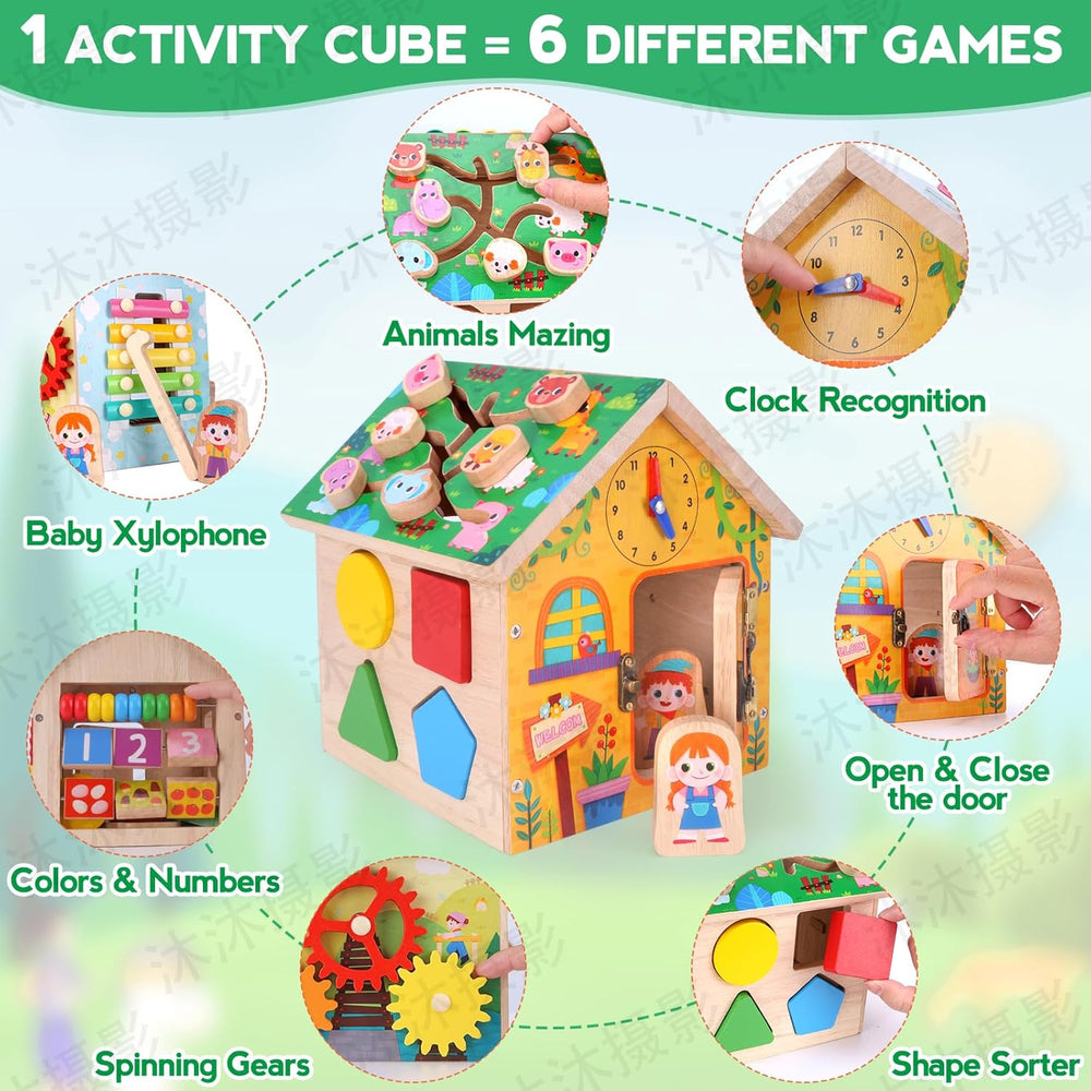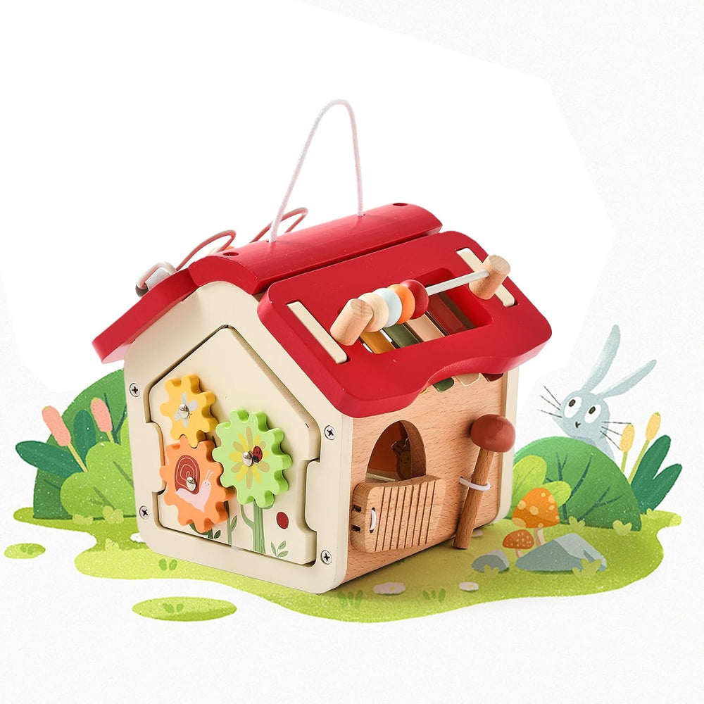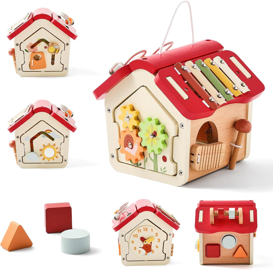 Youuys Montessori Motorikwürfel Holzspielzeug Montessori Spielzeug ab 1 Jahr 10 in 1(Rot) Holzhaus R