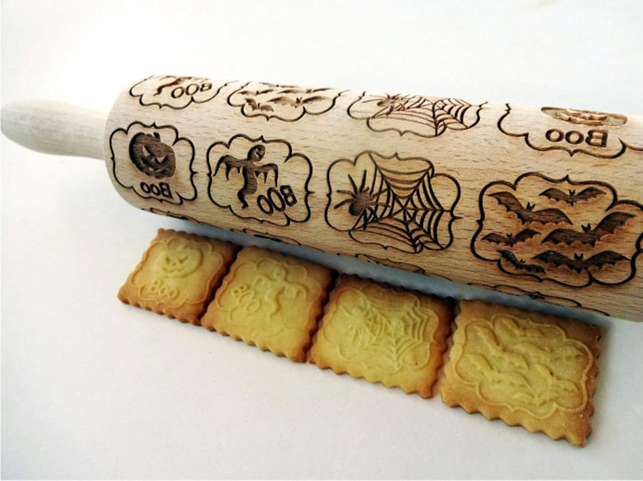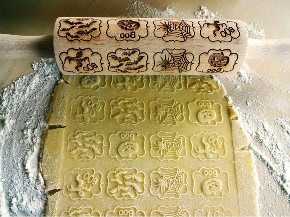 Teigroller HALLOWEEN FENSTER. Nudelholz mit Kürbis Spinne Fledermaus Geist. Nudelholz mit muster von