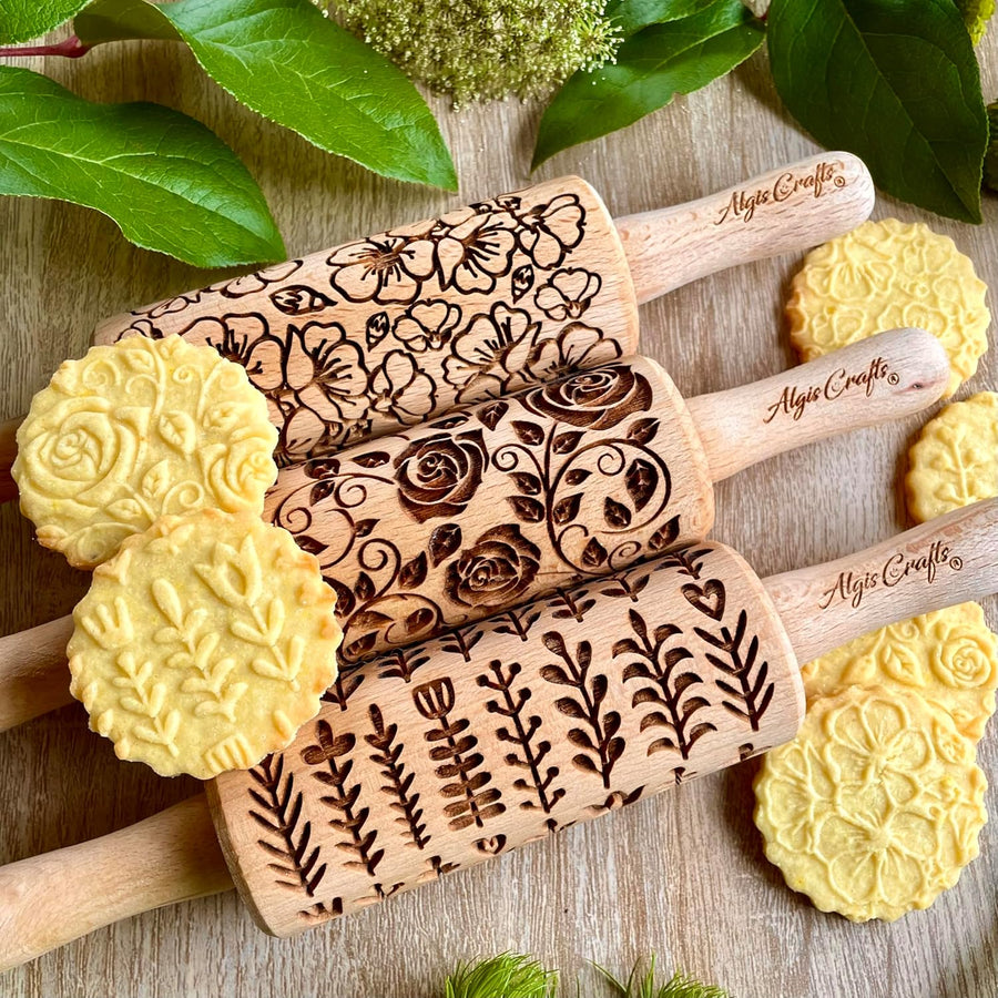 KLETTERBLUMEN Nudelholz. Teigroller mit Blumen für Hausgemachtes Gebäck und Keramik. Gravierte Nudel