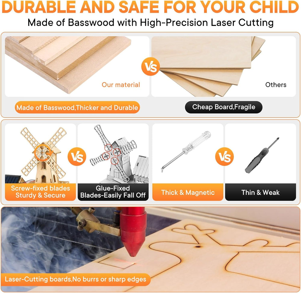 STEM Solarbetriebenes 3D Holzpuzzle - DIY Windmühlenhaus Bausatz,Wissenschaftliches Lernspiel für Ki