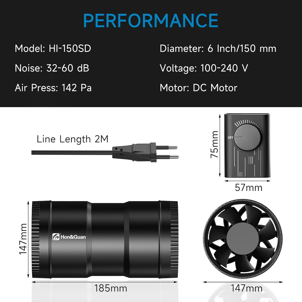 Hon&Guan 150 mm Rohrventilator Regelbar, 587 m³/h Rohrlüfter, Abluftventilator mit Stecker Upgrade C