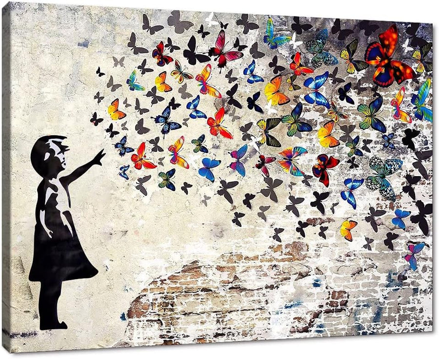 Graffiti-Strassen-Wandkunst, Banksy-Gemälde, Kunstwerk, gross, gerahmt, Graffiti-Mädchen mit Schmett