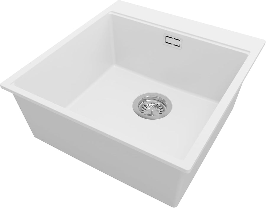PRIMAGRAN Granitspüle Weiss 48x50cm, Granitspüle 1 Becken + Ablauf-Set, Küchenspüle ab 50er Untersch