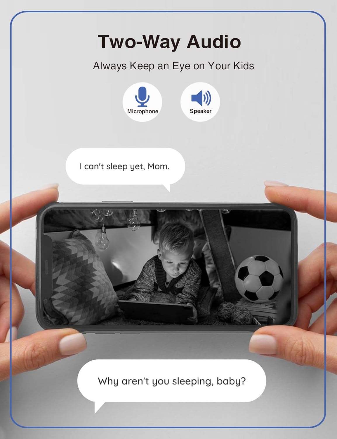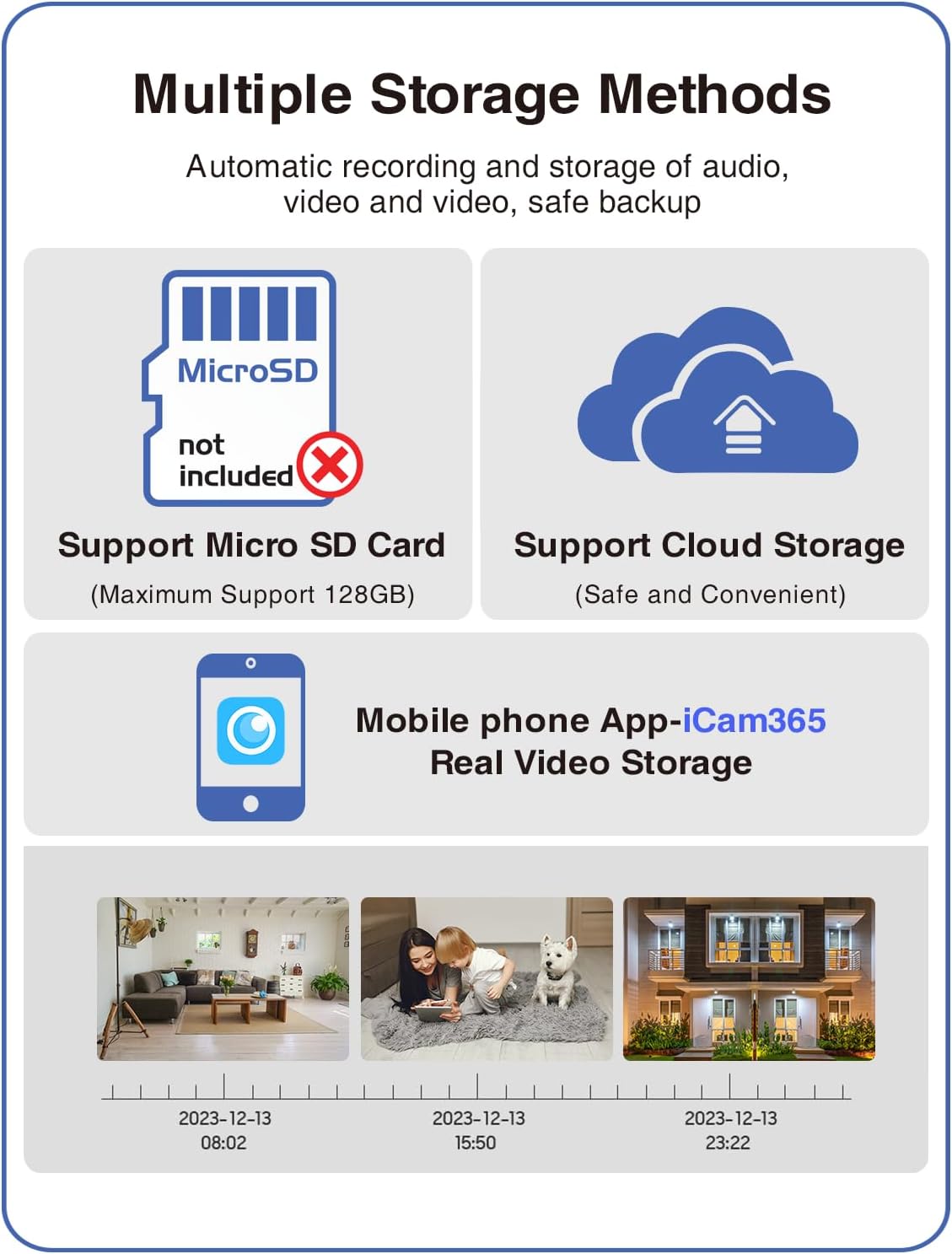 - 【Cloud- und SD-Kartenspeicher】 Die Aufzeichnungen dieses Babykameramonitors werden lokal auf einer Micro-SD-Karte gespeichert, unterstützen bis zu 128 GB Micro-SD-Karten und bieten 7 Tage kostenlosen Cloud-Speicher. Unsere Überwachungskamera bietet
