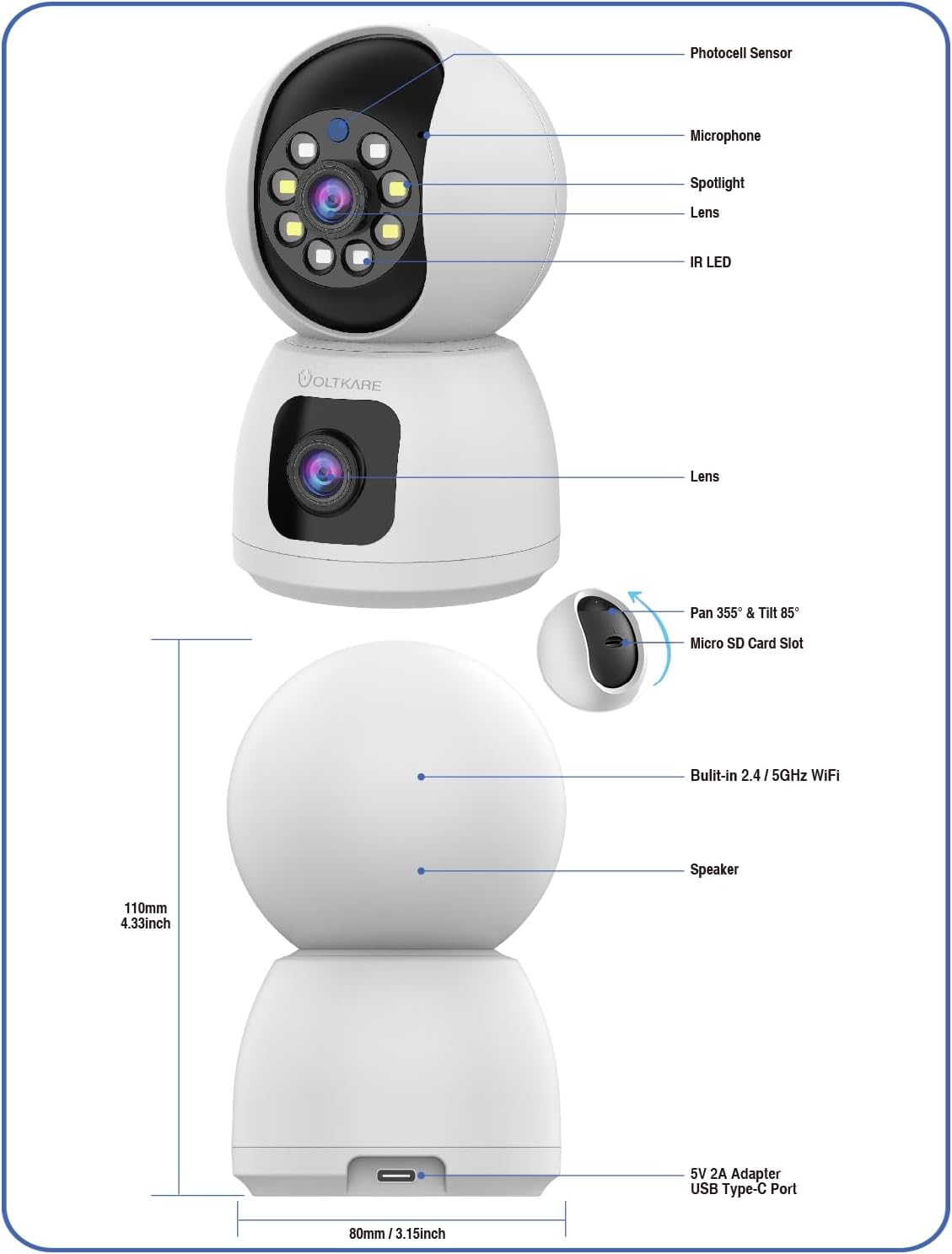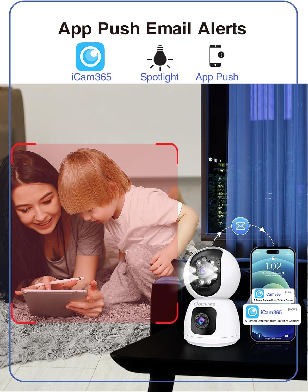 - 【360 ° Abdeckung und 2-in-1-Doppelobjektiv】 Die VOLTKARE-Überwachungskamera für den Innenbereich verfügt über zwei 2-MP-Objektive mit 355 ° horizontaler Drehung, 85 ° vertikaler Drehung und 4-fachem Digitalzoom, mit denen Sie jede Ecke Ihres