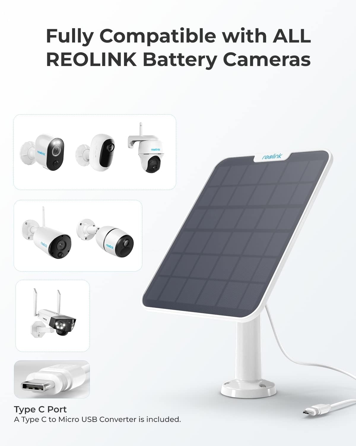 - Kompatible Kameras: Nur kompatibel mit allen Reolink Akku-Kameras wie Argus Eco, Argus 2E, Argus PT, Argus 3 Pro, Reolink Go Plus, Reolink Go PT Plus, Duo 4G, Duo 2 mit Akku, Duo 2 LTE mit Akku, TrackMix mit Akku, TrackMix LTE mit Akku etc.