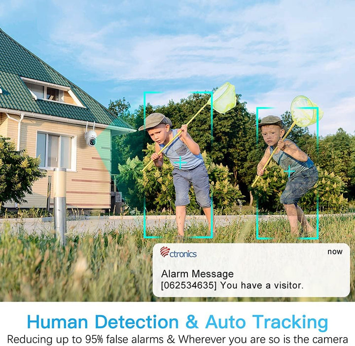 - 【Menschliche Erkennung & Automatische Verfolgung】 Diese wlan kamera outdoor verfügt über eine intelligente Menschen-Erkennungsfunktion, die nur Personen erkennt und bis zu 95% Fehlalarme durch Regen, Blätter, Tiere und Insekten reduziert. Darüber hinaus kann diese kamera auch automatisch menschliche Bewegungen verfolgen. Nach dem Erfassen des Ziels passt die 2K kamera die Schwenk-/Neigebewegung automatisch an und sendet Warnmeldunge Benachrichtigungen an Ihr Smartphone.