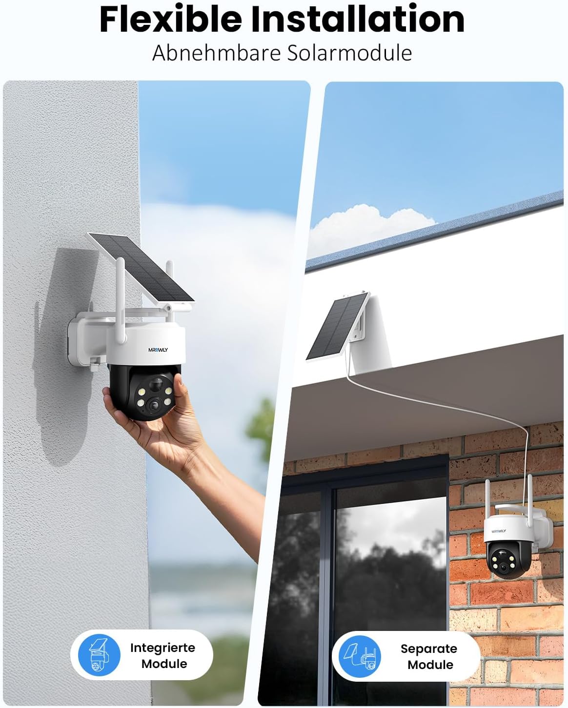 - 【Integrierte oder abnehmbare Panels】Mrowly-Solarpanels können als integrierte Einheiten oder separat installiert werden. Die Solarkamera gewährleistet eine ausreichende Stromversorgung und kann gleichzeitig auf den optimalen Blickwinkel für eine