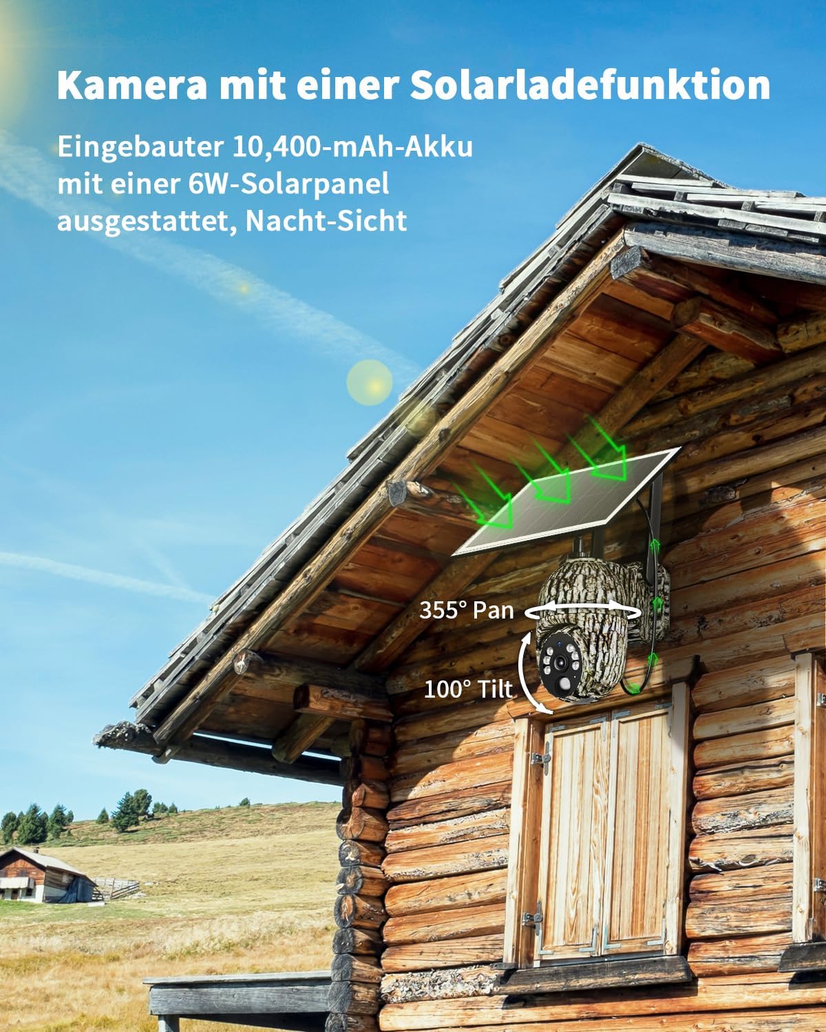 - 360° Rundumüberwachung: Die 4G Wildkamera Überwachungskamera aussen bietet mit ihrem 2K Ultra HD Objektiv und 360° Panoramablick eine umfassende Überwachungslösung. Mit Farbnachtsicht, PIR-Bewegungsmelder, Infrarot-LEDS und 355° Schwenk sowie